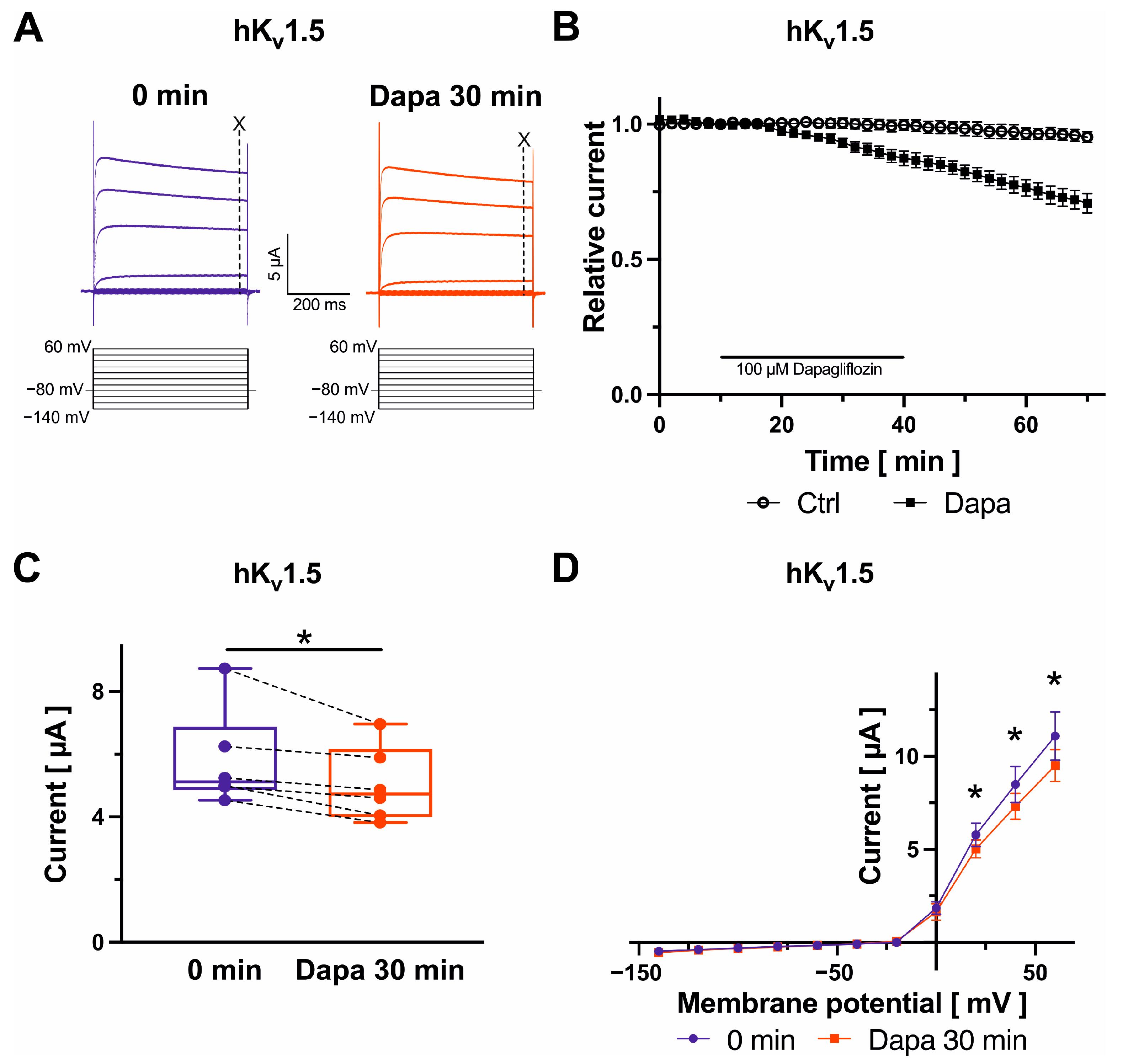 Figure 2. Biophysical effects of dapagliflozin on Kv1.5 channels. Original current traces evoked with indicated voltage protocols with time-point of analyses marked with dashed lines and “X” (A) and maximum current amplitudes at +20 mV are displayed before and after superfusion of cells with 100 µM dapagliflozin ((B) Dapa n = 6, Ctrl n = 4; (C) n = 6) for 30 min. Currents were normalized to the last current measurement under control conditions (panel (B)). Box plots represent median, 25th, and 75th percentiles, as well as minimum and maximum measured value. Dots in panel (C) represent raw data. Current–voltage relationships are provided in panel (D); * p < 0.05 (please note that p values are not indicated in panel (B) for clarity of data presentation).