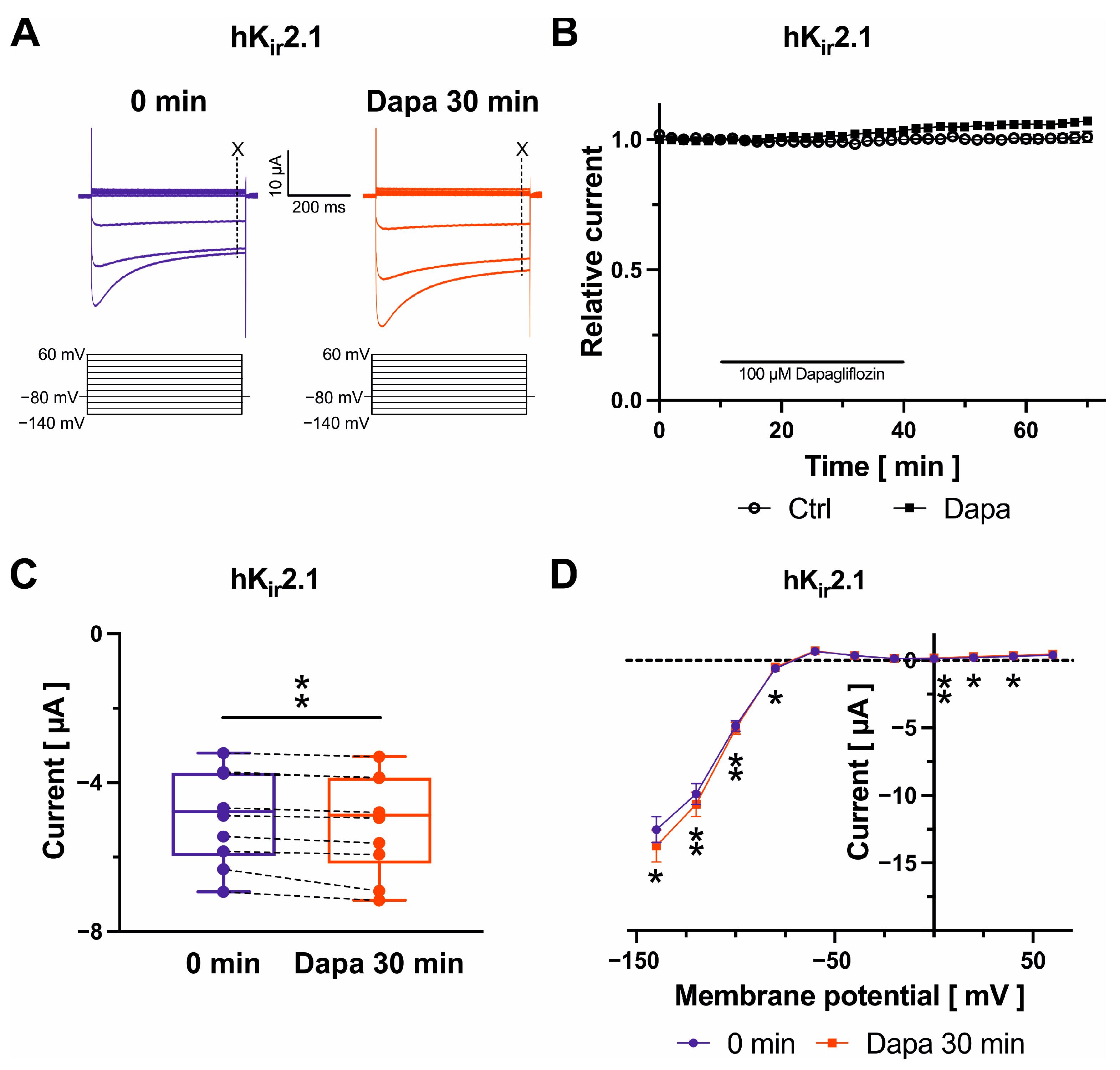 Figure 4. Biophysical effects of dapagliflozin on Kir2.1 channels. Typical current traces evoked with indicated voltage protocols with time-point of analyses marked with dashed lines and “X” (A) and maximum current amplitudes at −100 mV are shown before and after superfusion of cells with 100 µM dapagliflozin ((B) Dapa n = 10, Ctrl n = 5; (C) n = 10) for 30 min. Currents were normalized to the last current measurement under control conditions (panel (B)). Box plots represent median, 25th, and 75th percentiles, as well as minimum and maximum measured value. Dots in panel (C) represent raw data. Current–voltage relationships are displayed in panel (D); * p < 0.05, ** p < 0.01 (please note that p values are not indicated in panel (B) for clarity of data presentation).