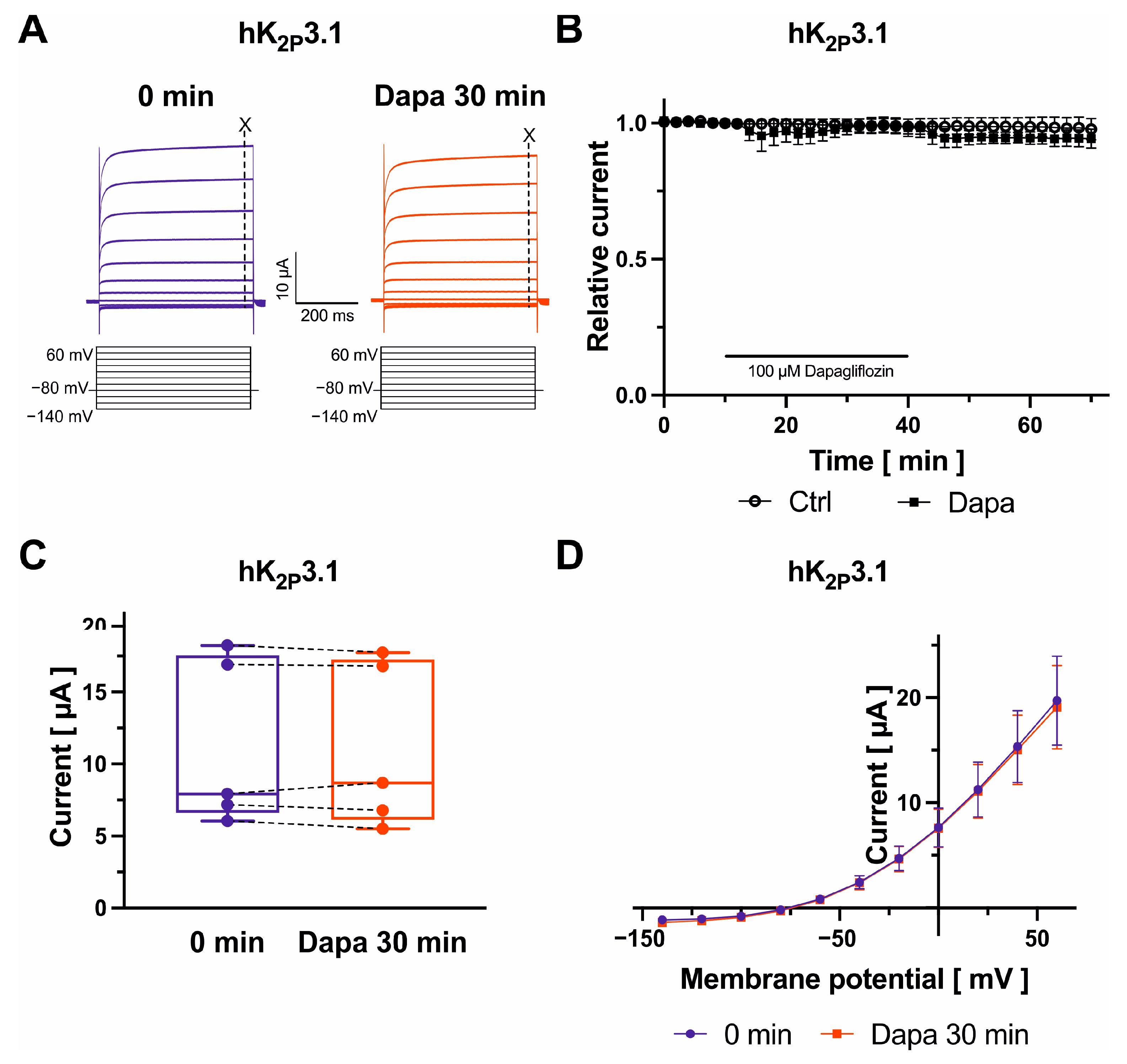 Figure 6. Biophysical effects of dapagliflozin on K2P3.1 channels. Representative recordings evoked with indicated voltage protocols with time-point of analyses marked with dashed lines and “X” (A) and maximum current amplitudes at +20 mV are provided before and after superfusion of cells with 100 µM dapagliflozin ((B) Dapa n = 5, Ctrl n = 5; (C) n = 5) for 30 min. Currents were normalized to the last current measurement under control conditions (panel (B)). Box plots represent median, 25th, and 75th percentiles, as well as minimum and maximum measured value. Dots in panel (C) represent raw data. Current–voltage relationships are displayed in panel (D).