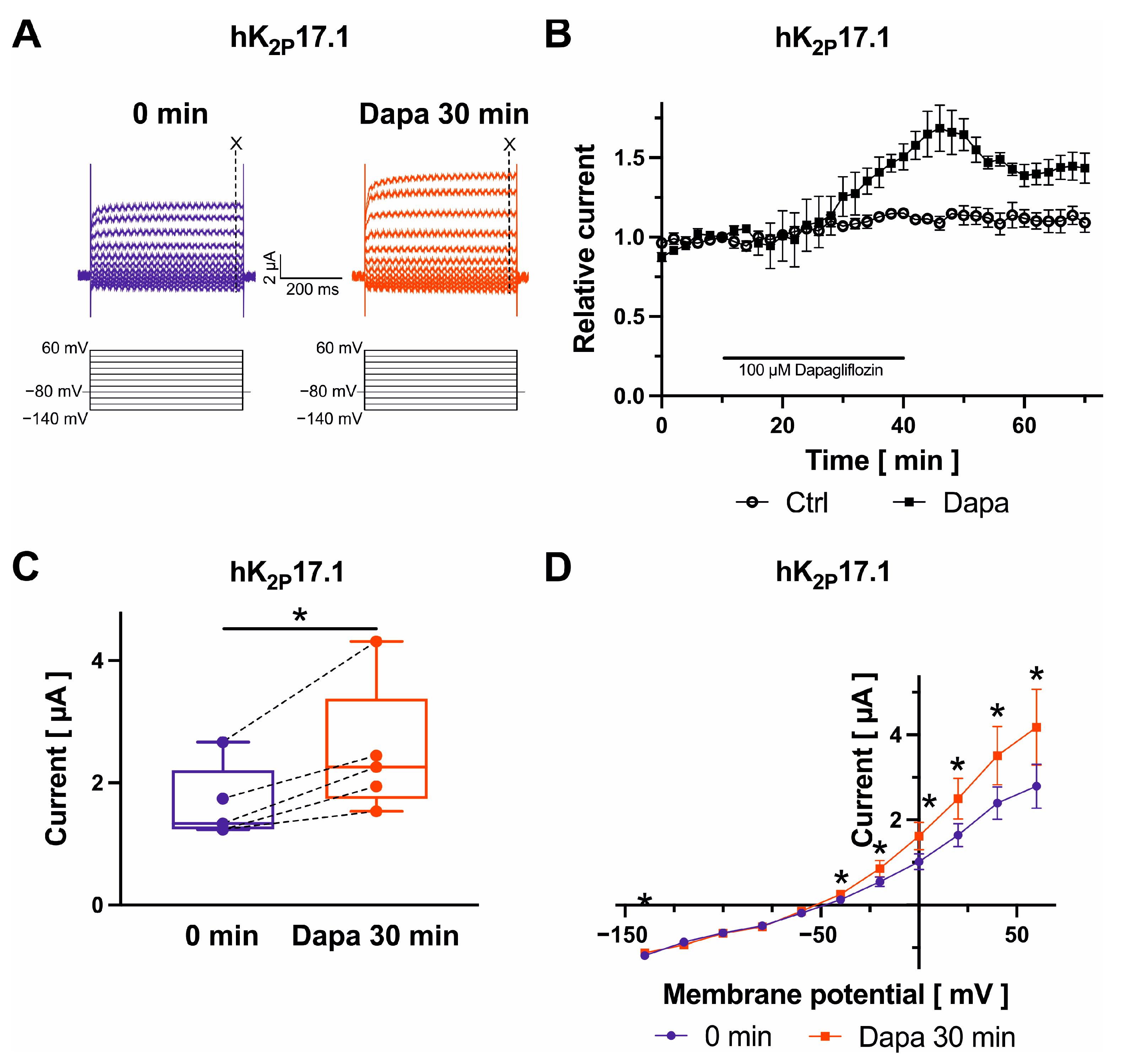 Figure 7. Biophysical effects of dapagliflozin on K2P17.1 channels. Representative recordings evoked with indicated voltage protocols with time-point of analyses marked with dashed lines and “X” (A) and maximum current amplitudes at +20 mV are provided before and after superfusion of cells with 100 µM dapagliflozin ((B) Dapa n = 5, Ctrl n = 6; (C) n = 5) for 30 min. Currents were normalized to the last current measurement under control conditions (panel (B)). Box plots represent median, 25th, and 75th percentiles, as well as minimum and maximum measured value. Dots in panel (C) represent raw data. Current–voltage relationships are displayed in panel (D); * p < 0.05 (please note that p values are not indicated in panel (B) for clarity of data presentation).