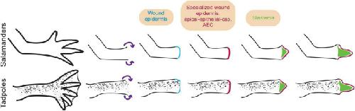 Xenopus laevis tadpoles lose their limb and tail regeneration abilities at specific developmental stages. Upon amputations, these animals cannot form an AEC (dark pink) at these stages but can still form the WE (light blue; Beck et al., 2009). (A)