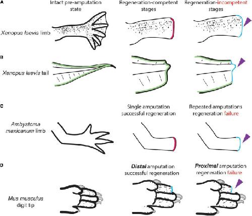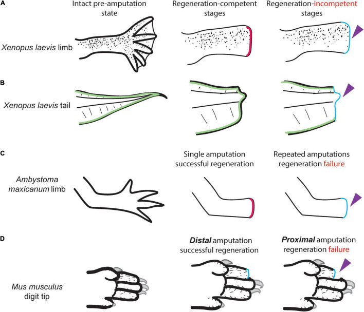 X. laevis tail regeneration depends on the ability to relocalize their regeneration-organizing cells (ROCs; green) to amputation plane to act as the AEC (Aztekin et al., 2019). Regeneration-incompetent tadpoles cannot relocalize their ROCs, but can still seal the amputation plane, hence they can form the WE. (C) Repeated amputation of the axolotl limb results in no regeneration that can form a WE (Bryant et al., 2017b). (D) Mouse digit tip regeneration is amputation position-dependent, yet both distal regenerative and proximal regeneration deficient amputations result in the WE formation (Simkin et al., 2015).