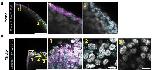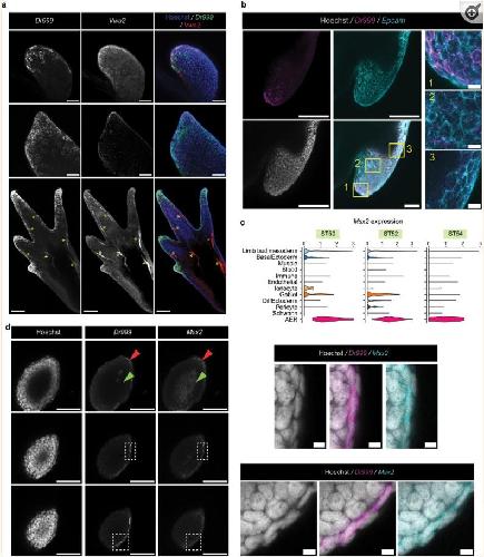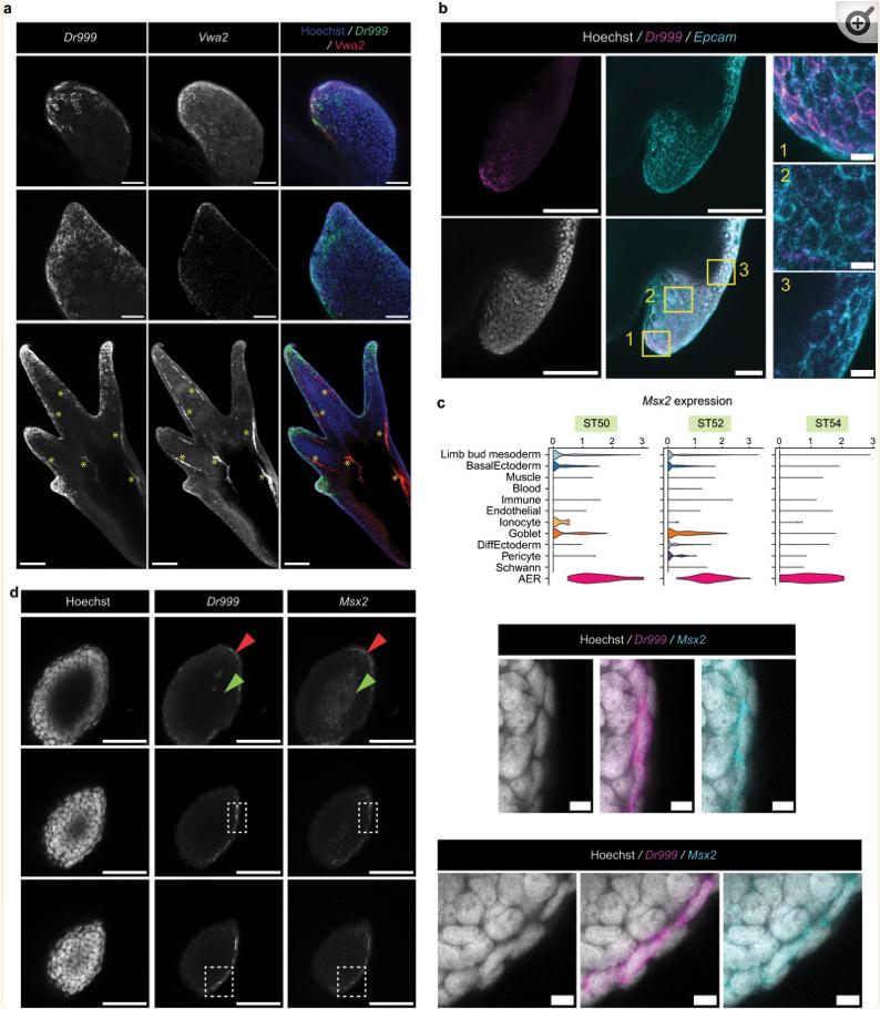 Fig. 2 Spatial organization of axolotl AER cells during limb development. a Max-projection confocal images of ST 46 (top), 50 (mid), and 53 (bottom) axolotl forelimbs correspond to ST50, 52, 54 hindlimb scRNA-Seq data, respectively, stained for Dr999 and Vwa2 mRNA via HCR. Green, Dr999 mRNA; Red, Vwa2 mRNA; Blue, Hoechst. Yellow * is added to the bottom images to indicate autofluorescence. Scale bar: 100 μm (top and mid) and 200 μm (bottom). b Max-projection confocal image of axolotl ST 53 hindlimb buds stained for Dr999 and Epcam mRNA via HCR. Gray, Hoechst; Magenta, Dr999 mRNA; Cyan, Epcam mRNA. Enlarged views of corresponding regions indicated by the numbered yellow boxes are shown side by side. Scale bar: 20 μm for zoomed images, 100 μm for the merged image and 200 μm for the others. c Msx2 expression in axolotl limb buds based on the scRNA-Seq datasets. d (Left) Max-projection confocal image of axolotl Stage 53 hindlimb buds stained for Dr999 and Msx2 mRNA via HCR. Scale bar: 100 μm. Red arrows show skin cells, and the green arrows show non-skin mesodermal cells to highlight Msx2 staining profile. (Right) Close-up images of the dashed labeled region of Dr999 and Msx2 double-positive skin cells. Scale bar: 10 μm. |