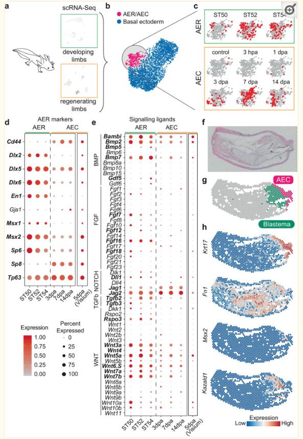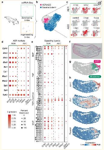 Fig. 3 Axolotl AER cells are not entirely re-formed during limb regeneration. a Schematics describing examples of the used scRNA-Seq datasets of axolotl limb development and regeneration are illustrated. b UMAP plot of the basal ectoderm cells of the integrated axolotl limb development and regeneration datasets. Subclustered cell identities are labeled by different colors and text. c Sample contribution to the integrated AER/AEC cluster from b. Red dots indicate cells from the selected sample; gray dots indicate the other cells in the AER/AEC cluster. hpa: hours-post amputation; dpa: days-post amputation. d Dot plot showing AER marker expressions in (left) the scRNA-seq datasets of axolotl limb development and regeneration AER or AEC clusters, respectively, and (right) spatial transcriptomics (Visium) AEC cluster (g). The dot color indicates the mean expression that was normalized to the max of each gene; the dot size represents the percentage of cells with non-zero expressions. Please note that the Visium and scRNA-seq datasets were normalized separately within the dataset. Significant differentially expressed genes between AER and AEC were labeled in bold (two-sided Wilcoxon rank-sum test; P-values < 0.05). e Dot plot showing signaling ligand expressions in (left) scRNA-seq datasets of axolotl limb development and regeneration AER or AEC cells, respectively, and (right) Visium AEC cluster (g). The dot color indicates the mean expression that was normalized to the max of each gene; the dot size represents the percentage of cells with non-zero expressions. Please note that the Visium and scRNA-seq datasets were normalized separately within the dataset. Significant differentially expressed genes between AER and AEC were labeled in bold (two-sided Wilcoxon rank-sum test; P-values < 0.05). f Hematoxylin and eosin stained 5 dpa axolotl limb regeneration tissue section. The tissue is oriented with the anterior to the top, the posterior to the bottom, proximal to the left, and distal to the right. g Clustering of the Visium spots identified known tissue types, including the AEC (pink) and the blastema (green). For the full clustering results, see Supplementary Fig. 15. h Expression profiles of selected markers in the AEC and the blastema clusters. |