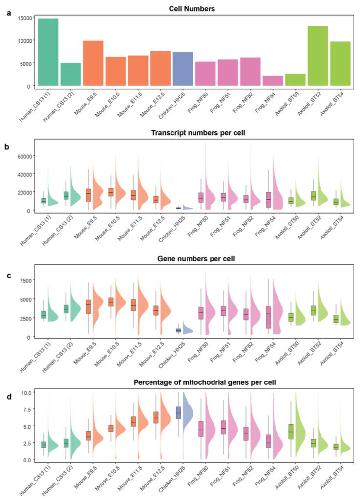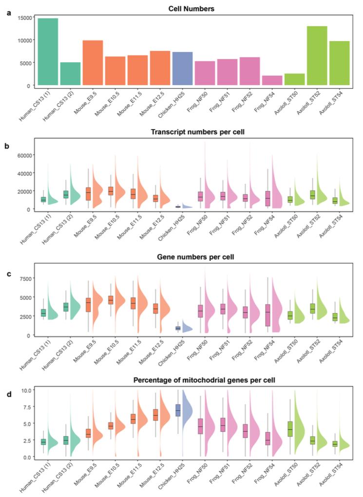 Supplementary Fig. 1 | Quality assessment of the re-analyzed publicly available limb development datasets of five species. a) Barplot showing the used cell numbers after filtering in each dataset is visualized. Two human datasets of the same developmental stage from independent studies were used and denoted as Human_CS13 (1) and Human CS13 (2). Please see Supplementary Data 1 for full details. b) Boxplot showing the transcript number per cell in each dataset is visualized. Please see Supplementary Data 1 for full details. c) Boxplot showing the gene numbers per cell in each dataset is visualized. Please see Supplementary Data 1 for full details. d) Boxplot showing the percentage of mitochondrial genes per cell in each dataset is visualized. Please see Supplementary Data 1 for full details. |