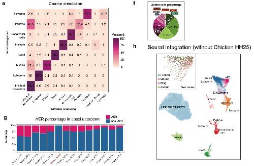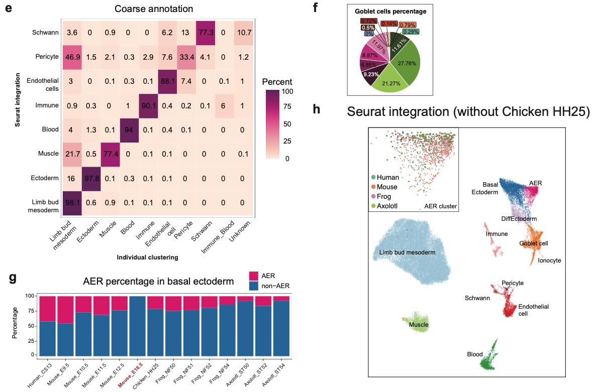 Supplementary Fig. 3 | Seurat-integrated multi-species limb atlas. e) A confusion matrix is plotted to determine the annotation accuracy for cells between the Seurat- integrated multi-species atlas and individual maps from Supplementary Fig. 2. f) Pie chart showing the percentage of cells from each species and developmental stages in the Goblet cells cluster in the Seurat-integrated UMAP in Fig. 1a. g) Barplot showing the ratio of identified AER cluster to the whole basal ectoderm cluster in indicated species and developmental stages. h) UMAP plot of Seurat-integrated multi-species limb atlas without the chicken dataset. Cells are colored by their lineages and cell type identities. Inserted box: the species contribution to the AER cluster is visualized. Cells from different species are color-coded. |