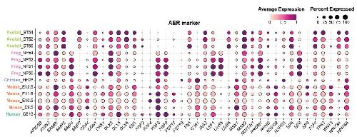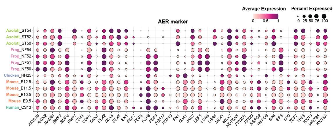 Supplementary Fig. 5 | AER marker expressions in AER cells of the analyzed species. Dotplot showing an extended list of AER markers. The dot color indicates the mean expression that was normalized to the max of each cell type and to the max of each gene; the dot size represents the percentage of cells with non-zero expression. Please note that some of the genes in this figure and their values are the same as in Fig. 1e. |