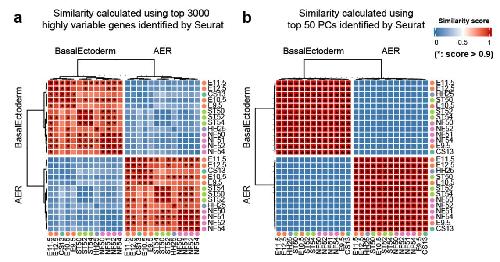 Supplementary Fig. 6 | Basal ectoderm and AER clusters similarities of the analyzed species. Heatmaps showing the pair-wise similarity scores of basal ectoderm and AER clusters across species. X and Y axes indicate different species with their developmental stages. Similarity scores are calculated by using (a) the top 3000 highly variable genes, and (b) the top 50 principal components. Asterisks (*) denote the pairs with similarity scores above 0.9. AER clusters are compared to basal ectoderm clusters to highlight specific transcriptome profiles. |