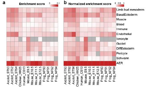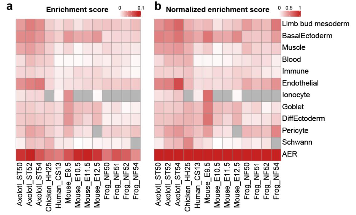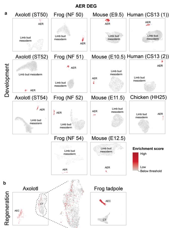 Supplementary Fig. 17 | Single cell gene set enrichment analysis (scGSEA) using differentially expressed AER gene sets for individual datasets. UMAP visualization of the scGSEA of indicated datasets of limb development (a) and regeneration (b) based on the top 500 AER DEGs in multi-species limb atlas (Fig. 1b). The enrichment scores are indicated in shades of red. Cells failed to pass the enrichment threshold are colored in grey. |