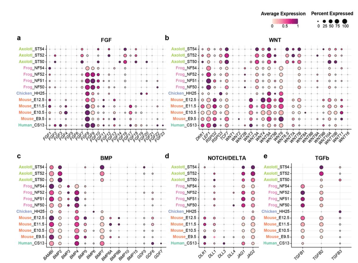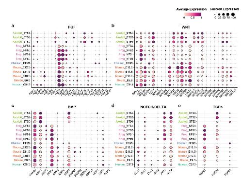 Supplementary Fig. 8 | Signaling pathways-associated gene expressions in AER cells in the analyzed species. Dotplots showing expression profiles of various genes from FGF (a), WNT (b), BMP (c), NOTCH (d), and TGFb (e) pathways. The dot color indicates the mean expression that was normalized to the max of each cell type and to the max of each gene; the dot size represents the percentage of cells with non-zero expression. |