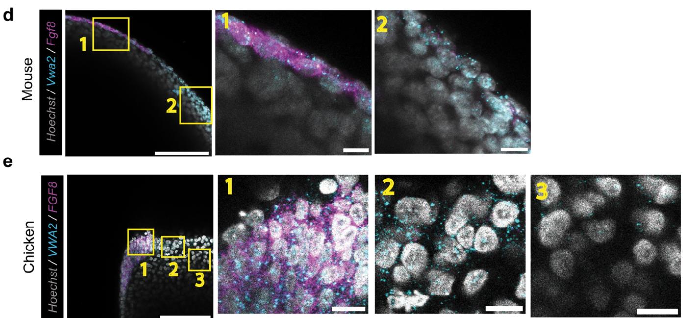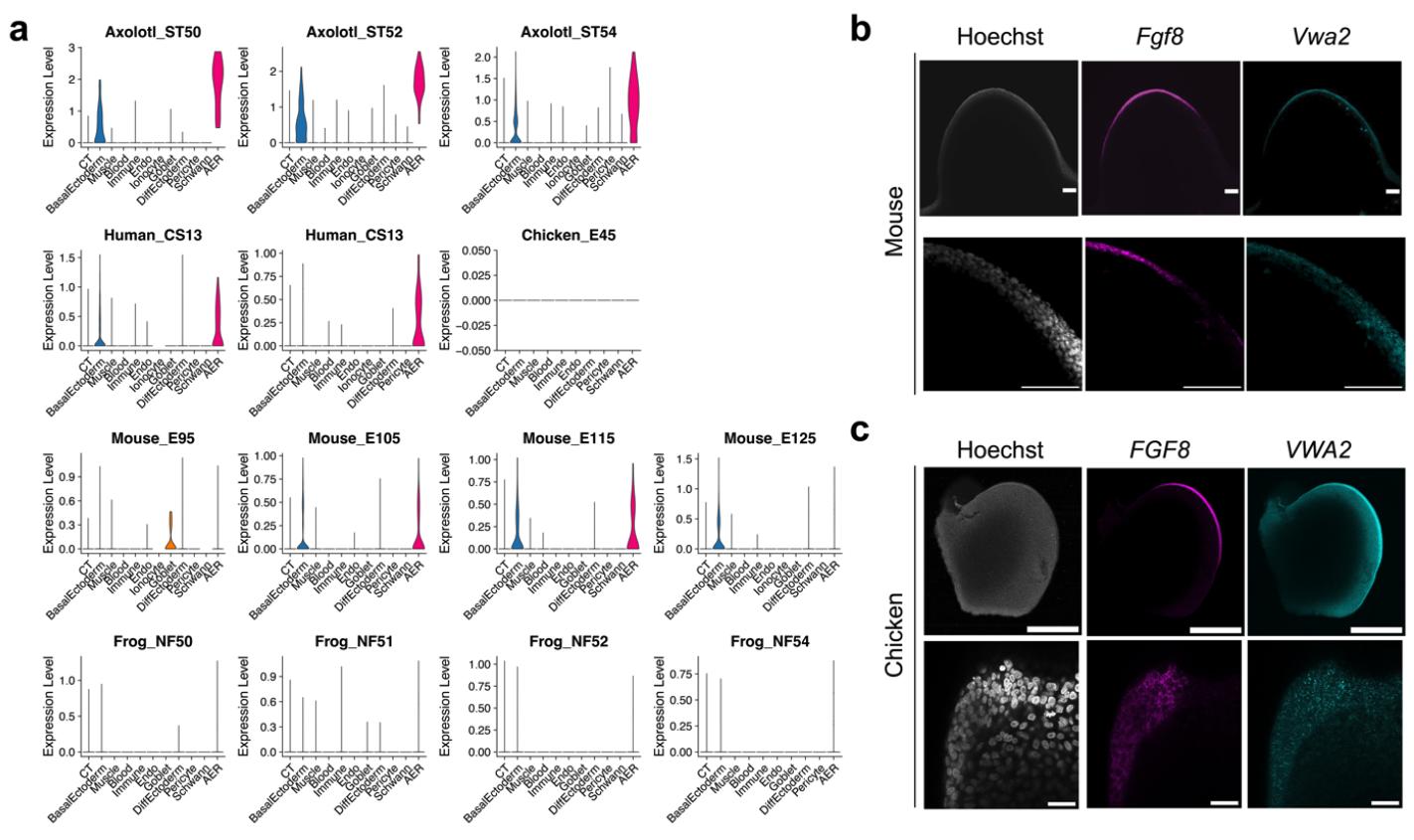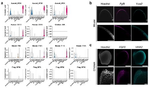 Supplementary Fig. 10 | Vwa2 expression in humans, mice, chickens, and frogs. a) Violin plots showing Vwa2 expression across all cell types in indicated species and developmental stages based on the analyzed scRNA-Seq datasets. b) Max-projection confocal image of mouse E10.5 hindlimb limb buds stained for Fgf8, and Vwa2 mRNA via HCR. Gray, Hoechst; Magenta, Fgf8 mRNA; Cyan, Vwa2 mRNA. Scale bar: 100 μm for both. c) Max-projection confocal image of chicken HH22 hindlimb buds stained for Fgf8, and Vwa2 mRNA via HCR. Gray, Hoechst; Magenta, Fgf8 mRNA; Cyan, Vwa2 mRNA. Scale bars: (Top) 250 μm and (Bottom) 25 μm. |