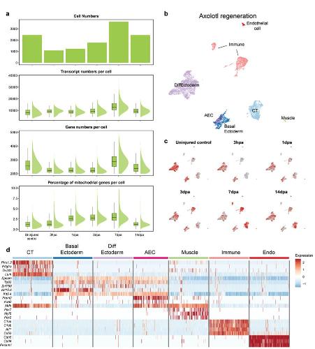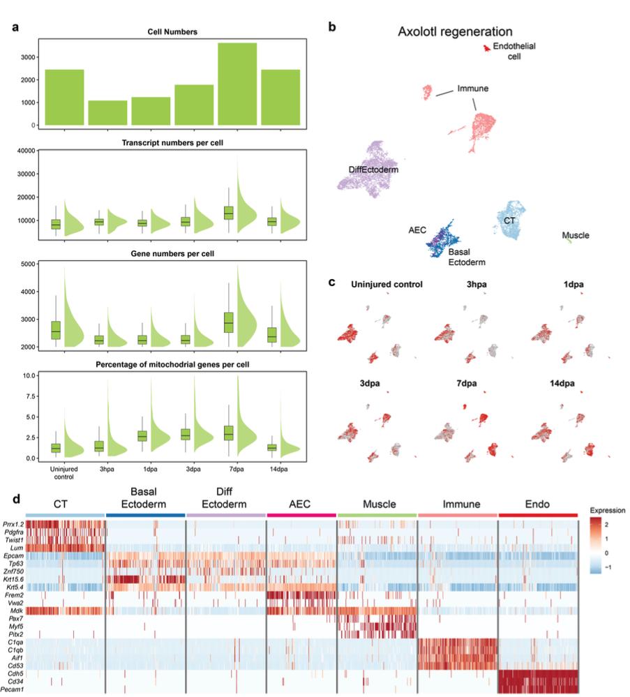 Supplementary Fig. 13 | Quality assessment of re-analyzed publicly available axolotl limb regeneration dataset. a) Barplots showing the used cell numbers, the transcript number per cell, the gene numbers per cell, and the percentage of mitochondrial genes per cell after filtering in axolotl limb regeneration datasets are visualized. b) UMAP plot of the identified and annotated clusters. Clusters were annotated based on marker genes listed in Supplementary Fig. 13d. The AEC cells were identified by the analysis described in the text and in Fig. 3a-c, then re-plotted and colored dark pink in this figure. c) Sample contribution to the axolotl regeneration dataset is visualized. Red dots indicate cells from the selected sample; gray dots indicate the other cells. hpa: hours-post amputation; dpa: days-post amputation. d) Heatmap showing the expression profile of marker genes that are used to annotate clusters, except AEC cells and their marker expressions indicated following the analysis indicated in text and Fig. 3a-c. |