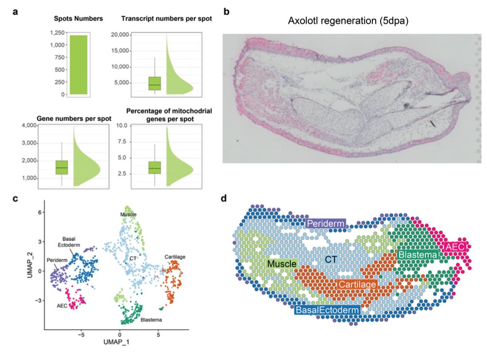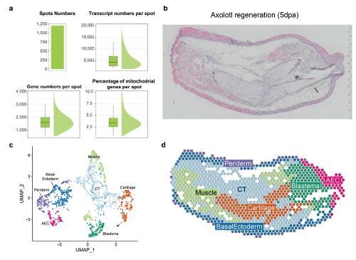 Supplementary Fig. 15 | Quality assessment and clustering results of axolotl 5 days-post- amputation 10X Visium spatial transcriptomics (Visium) dataset. a) Barplots showing used Visium spot numbers, transcript number per spot, gene numbers per spot, and the percentage of mitochondrial genes per spot after filtering are visualized. b) 5 dpa axolotl limb regeneration tissue section that is used for the Visium is shown and stained for hematoxylin and eosin. Please note that this image is the same as Fig. 3f but added in this figure for easier visual comparison to Supplementary Fig. 15d, which contains full annotation. c) UMAP plot of the Visium clusters is shown. Clusters were annotated by marker gene expressions (Supplementary Fig. 15e) and confirmed by morphologies in hematoxylin and eosin staining on the tissue section in Fig. 3f and Supplementary Fig. 15b. The identified clusters are color-coded and tissue annotation is labeled. d) Visium spots were colored by tissue types identified in Supplementary Fig. 15c. |