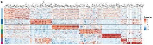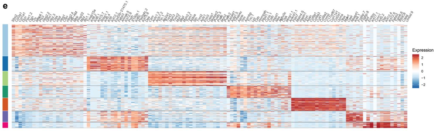 Supplementary Fig. 15 | Quality assessment and clustering results of axolotl 5 days-post- amputation 10X Visium spatial transcriptomics (Visium) dataset. e) Heatmap showing the top 20 DEGs (ordered by fold change) for the identified clusters is shown. |