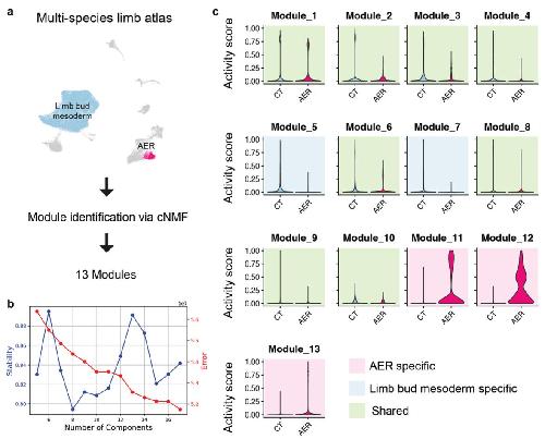 Supplementary Fig. 16 | Consensus nonnegative matrix factorization (cNMF) to identify AER- related modules. a) The strategy to perform consensus negative matrix factorization (cNMF) is described. cNMF was used on AER and CT clusters to identify cell identity and cell activity modules. b) Stability (blue line) is measured by the Euclidean distance silhouette score of the clustering and Frobenius error of the consensus solution (red line) for each tested k value (module number) shown in the X axis. Please see Methods for more detail. c) Violin plots showing activity scores for identified cNMF modules in CT and AER clusters. Modules specific to AER, CT, or shared are color-coded: pink, AER-specific modules; blue, CT- specific modules; green, shared modules. |