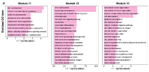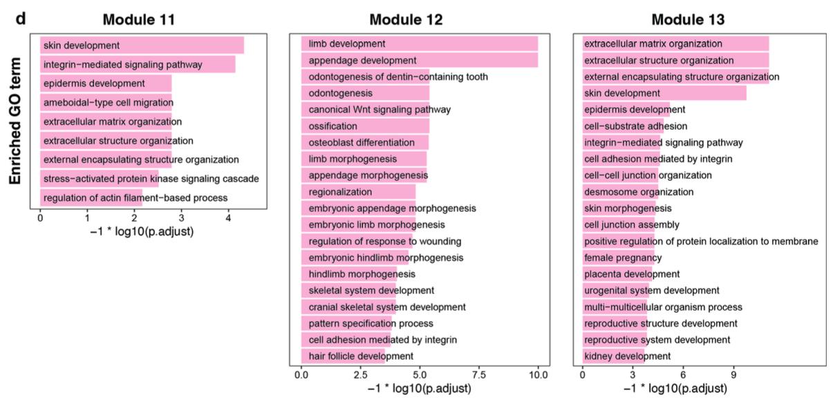 Supplementary Fig. 16 | Consensus nonnegative matrix factorization (cNMF) to identify AER- related modules. d) Enriched GO terms are determined for the top 100 genes (ordered by gene expression program scores) in the identified AER-specific modules. Barplot showing the top GO is visualized, and GO terms are labeled. |