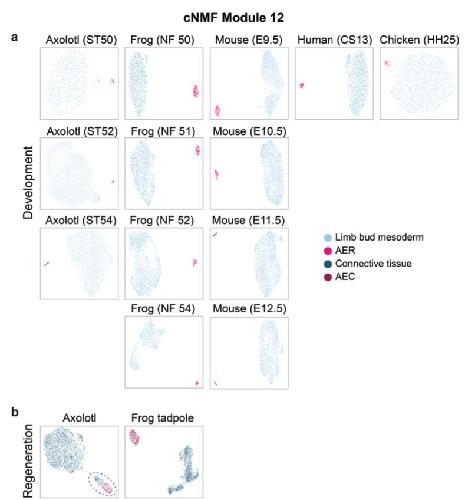 Supplementary Fig. 20 | Clustering based on cNMF module 12 for individual datasets. UMAP visualization of the clustering of indicated datasets of limb development (a) and regeneration (b) based on the top 500 genes from AER-specific cNMF module 12 (Supplementary Fig. 16 and Supplementary Data 4). In development datasets: light blue, limb bud mesoderm cells; pink, AER cells. In regeneration datasets: dark blue, CT cells; dark pink, AEC cells. Connective tissue cells gathered with the AEC population are highlighted with a dashed line. |