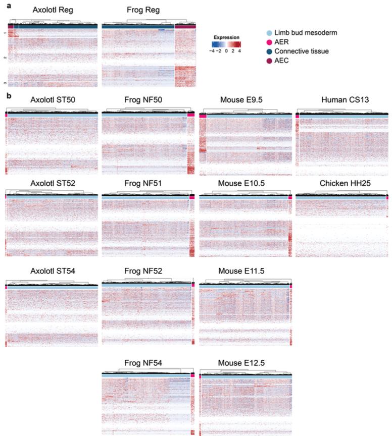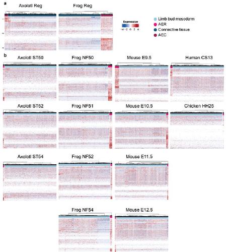 Supplementary Fig. 22 | AER gene expression profile in AER, AEC, limb bud mesoderm, and connective tissue cells during limb development and regeneration. Heatmaps showing the expression profile of 500 AER DEGs in regenerating limbs (a) and developing limbs (b). For axolotl regenerating limbs (Axolotl Reg), genes were grouped into three by the K- means algorithm, and the first group is shown in Fig. 4d. Please note that part of the axolotl regeneration dataset is also presented in Fig. 4f. Colored squares above the heatmap represent cells from indicated populations: light blue, limb bud mesoderm cells in the development dataset; light pink, AER cells in the development dataset; dark blue, connective tissue cells in the regeneration dataset; dark pink, AEC cells in the regeneration dataset. |