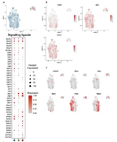 Supplementary Fig. 23 | Mesodermal cells showing AER transcriptional program are present in intact limbs and express signaling ligands. a) (Top) UMAP plot from Fig. 4c and Supplementary Fig. 18b axolotl regeneration dataset is used to distinguish mesodermal cells showing part of the AER program and labeled by green. The rest of the connective tissue is labeled dark blue, and AEC is labeled dark pink. (Bottom) Dotplot showing signaling ligands expressions in the populations distinguished in Supplementary Fig. 23a. The dot color indicates the mean expression that was normalized to the max of each cell type and to the max of each gene; the dot size represents the percentage of cells with non-zero expression. b) The expression profile of previously reported regeneration-associated genes (18–20) in the UMAP plot of clustering in Fig 4c axolotl regeneration dataset. c) Sample contribution to UMAP plot of re-clustered regeneration dataset is visualized. Red dots indicate cells from the selected sample; gray dots indicate all the other cells. |