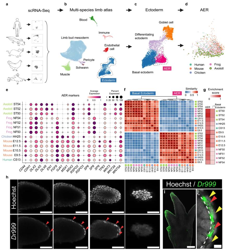 Fig. 1 Multi-species limb atlas reveals developing axolotl limbs have cells with apical-ectodermal-ridge (AER) characteristics. a Schematic to generate a multi-species limb atlas using publicly available single-cell RNA-Seq (scRNA-Seq) datasets. b UMAP plot of Seurat-integrated multi-species limb atlas. Individual datasets from each species with different developmental stages are integrated. Dots are colored by cell identities. c UMAP plot of the ectodermal lineage. Dots are colored by cell identities. d UMAP plot of species contribution to the AER cluster. Dots are colored by species. e Dot plot showing AER marker expressions in AER cells from different species. The dot color indicates the mean expression that was normalized to the max of each dataset and to the max of each gene; the dot size represents the percentage of cells with non-zero expression. f Heatmap showing the MetaNeighbor score for pair-wise similarities of basal ectoderm and AER clusters. X- and Y-axes indicate species and developmental stages. Asterisks (*) denote the pairs with scores above 0.9. Source data provided as a Source data file. g Heatmap showing signaling ligands gene set enrichment analysis scores for AER, and non-AER basal ectoderm clusters. The basal ectoderm represents the transcriptome-wide most similar population to the AER, and is used for comparison. Colored dots in the Y-axis indicate different species. Source data provided as a Source data file. h Single optical section of z-stacks of confocal images of Stage 46 axolotl forelimb buds stained for Dr999-Pmt21178 (referred to as Dr999) mRNA via hybridization-chain-reaction (HCR). Different z-stacks were shown from left to right, representing different levels of the dorsal-ventral axis. (Top) Gray, Hoechst; Bottom Gray, Dr999 mRNA. Scale bar: 100 μm. i Max-projection confocal image of Stage 53 axolotl forelimb digit tips stained for Dr999 mRNA via HCR. Green, Dr999 mRNA; Gray, Hoechst. Scale bar: 250 μm. j Zoomed single optical section image of the axolotl limb bud from (h) stained for Dr999 mRNA. Red arrows show Dr999+ squamous cells, and yellow arrows show outer layer peridermal cells. The basement membrane is labeled with a dashed line. Green, Dr999 mRNA; Gray, Hoechst. Scale bar: 10 μm. |