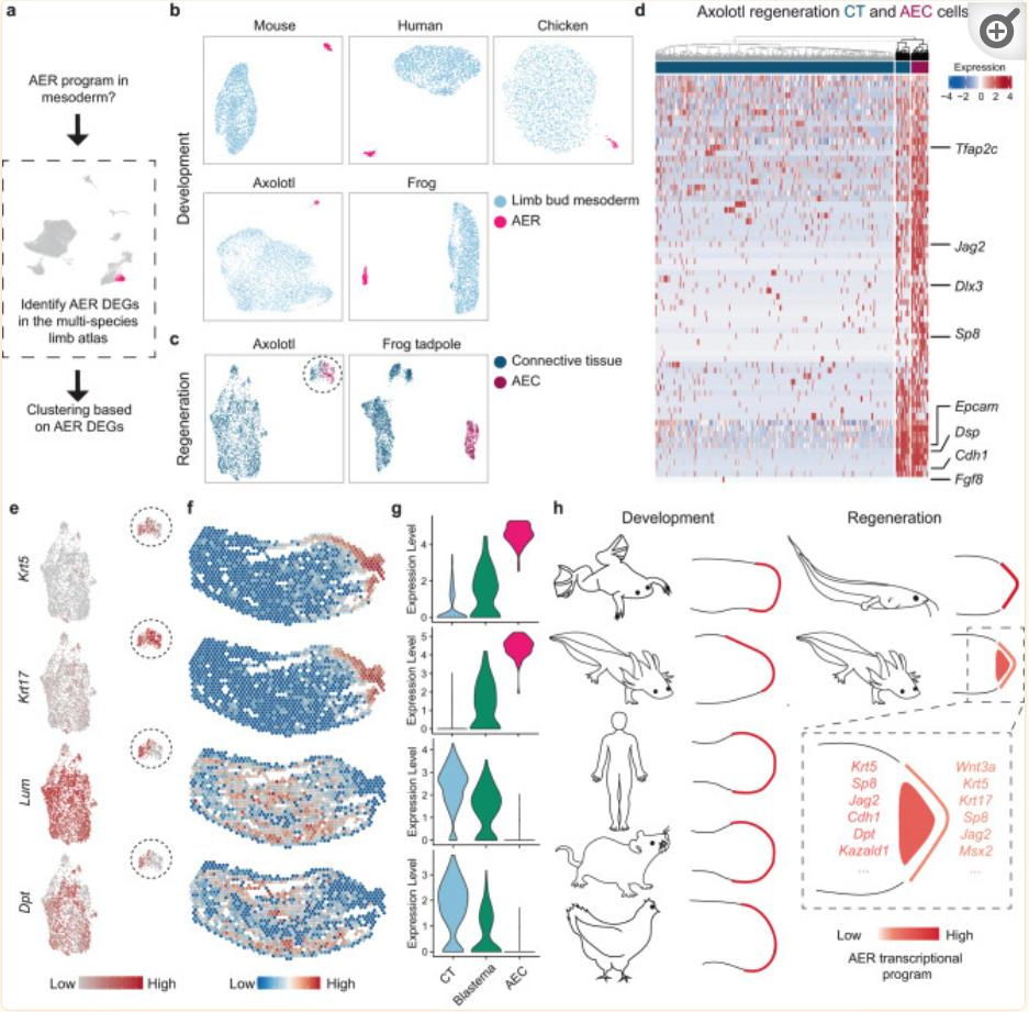 Fig. 4 Axolotl limbs contain mesodermal cells showing part of the epithelial AER transcriptional program. a Schematics of the strategy to evaluate the mesodermal cells showing the AER transcriptional program. AEC and connective tissue (CT) cells are clustered based on differentially expressed genes (DEGs) in the AER cluster of the multi-species limb atlas. b UMAP plots of the clustering based on the DEGs in the AER cluster of the multi-species limb atlas (Fig. 1b) for development datasets. Mouse E10.5, chicken E4.5, human CS13, frog NF51, and axolotl ST52 UMAPs are shown. Light blue, limb bud mesoderm cells; pink, AER cells. c UMAP plots of the clustering based on the DEGs in the AER cluster of the multi-species limb atlas for the regeneration datasets. Dark blue, CT cells; dark pink, AEC cells. CT cells gathered with the AEC and the AEC are circled with a dashed line. d Heatmap showing shared gene expressions in the axolotl CT and AEC populations. Dendrogram based on gene expression profile indicates a subset of CT cells shows similarity to the AEC population and is highlighted with black dendrograms. Note that these shared genes were identified by K-means clustering (Supplementary Fig. 22a) of the whole AER gene list used in Fig. 4b, c, except for the manually added Fgf8 due to its high relevance to AER. e The expression profile of the example epithelial and fibroblast genes in the UMAP plot in Fig. 4c axolotl regeneration dataset. f Expression profiles of the example epithelial and fibroblast genes are visualized on the Visium dataset. Please note that the Krt17 data is the same as in Fig. 3h. g Violin plot showing expression levels of the example epithelial and fibroblast genes in the CT, the blastema, and the AEC clusters of the Visium dataset. h Schematics illustrating the AER transcriptional program in developing (axolotl, frog, human, mouse, chicken) (left) and regenerating (axolotl, frog tadpole) limbs (right). Red to orange colors are used to indicate changes in the AER transcriptional program, relevant explicitly in the axolotl regeneration schematics. Dash rectangle indicates the zoom-in view of the axolotl regenerating limb with selected AER genes. |