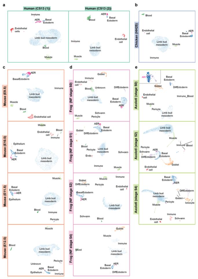 Supplementary Fig. 2 | UMAP visualization of the re-analyzed individual datasets of limb development. UMAP visualization of individual limb development datasets for (a) human, (b) chicken, (c) mouse, (d) frog, and (e) axolotl are visualized. Two human datasets of the same developmental stage from independent studies were used and denoted as Human_CS13 (1) and Human CS13(2). Lineage and cell type annotations are based on marker genes in Supplementary Fig. 3, and labeled by different colors and text, except the axolotl AER cells, which are identified based on Fig. 1d and re-plotted in this figure. Note that to highlight the identified AER-like cells in the axolotl stage 50 sample, a zoom- in view of the ectoderm population is shown in the upper left corner. |