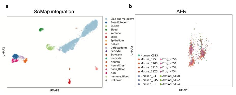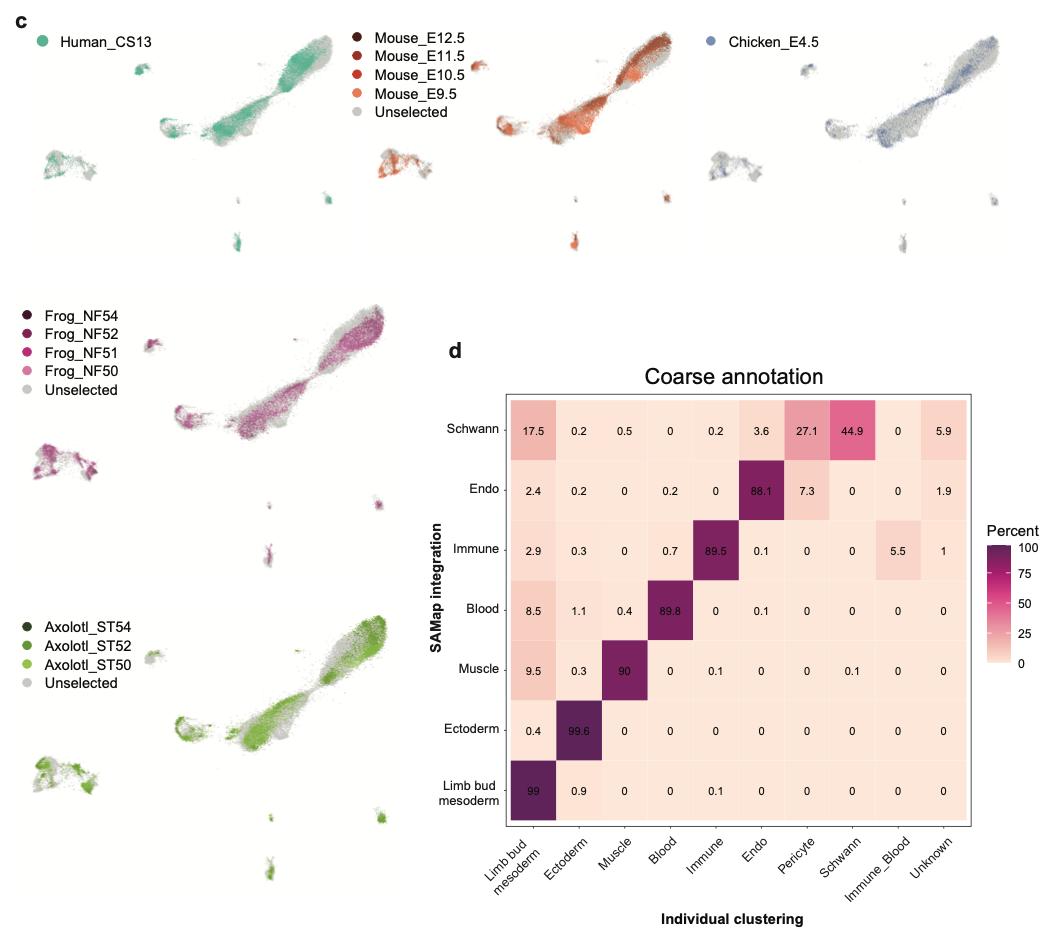 Supplementary Fig. 4 | SAMap-integrated multi-species limb atlas. c) UMAP plot of species contribution to the SAMap-integrated multi-species limb atlas AER cluster is visualized. Cells from different species are color-coded and the developmental stage is indicated. d) A confusion matrix is plotted to determine the annotation accuracy between the SAMap- integrated multi-species atlas and individual maps from Supplementary Fig. 2. |