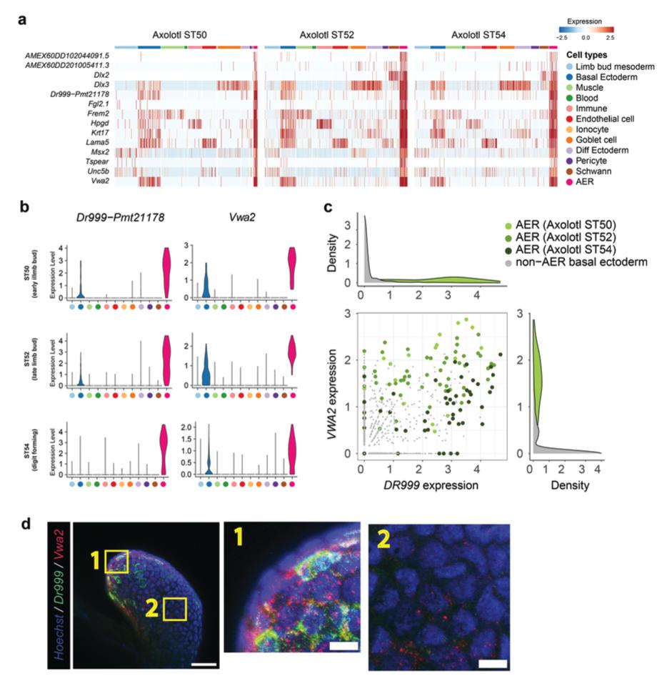 Supplementary Fig. 9 | Spatial organization of axolotl AER cells during limb development. a) Heatmap showing the expression of 14 shared AER-specific differentially expressed genes in different cell types in axolotl developing limbs. Stages are indicated on the top. b) Violin plots showing expression levels of the putative axolotl AER markers are shown. Please note that the analyzed scRNA-Seq datasets are for hindlimbs, and morphologies of corresponding developing limbs are indicated in the figure. c) Co-expression of AER-like genes in the ectoderm in axolotl limb buds. Scatter plot (lower left) shows the co-expression pattern of Dr999-Pmt21178 and Vwa2. Each dot represents a cell whose location is defined by its expression of Dr999-Pmt21178 (x-axis) and Vwa2 (y-axis). AER-like cells are colored in shades of green while non-AER ectoderm in grey. Density plots representation of the distribution of the Dr999-Pmt21178 (top) and Vwa2 (lower right) expression in AER (in green) and non-AER ectoderm (in grey). d) (Left) Merged image of the top row in Fig. 2a. Scale bar 100 μm. (Right) Enlarged views of corresponding regions indicated by the numbered yellow boxes. Scale bar 20 μm. |