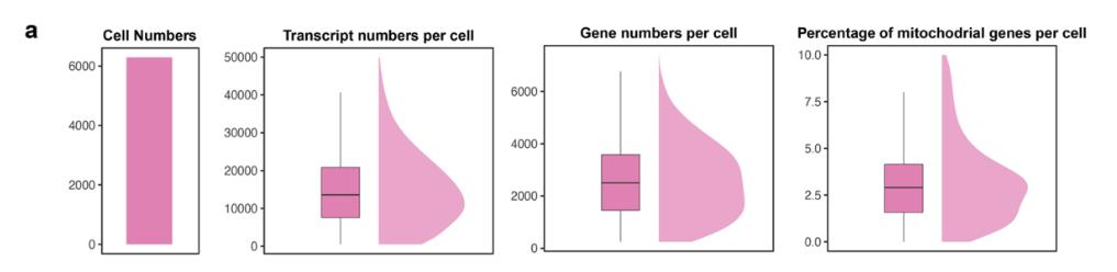 Supplementary Fig. 12 | Quality assessment of the re-analyzed publicly available Xenopus limb regeneration dataset. a) Barplots showing the used cell numbers, the transcript number per cell, the gene numbers per cell, and the percentage of mitochondrial genes per cell after filtering in Xenopus laevis 5 days-post amputation (dpa) limb regeneration dataset are visualized. |
