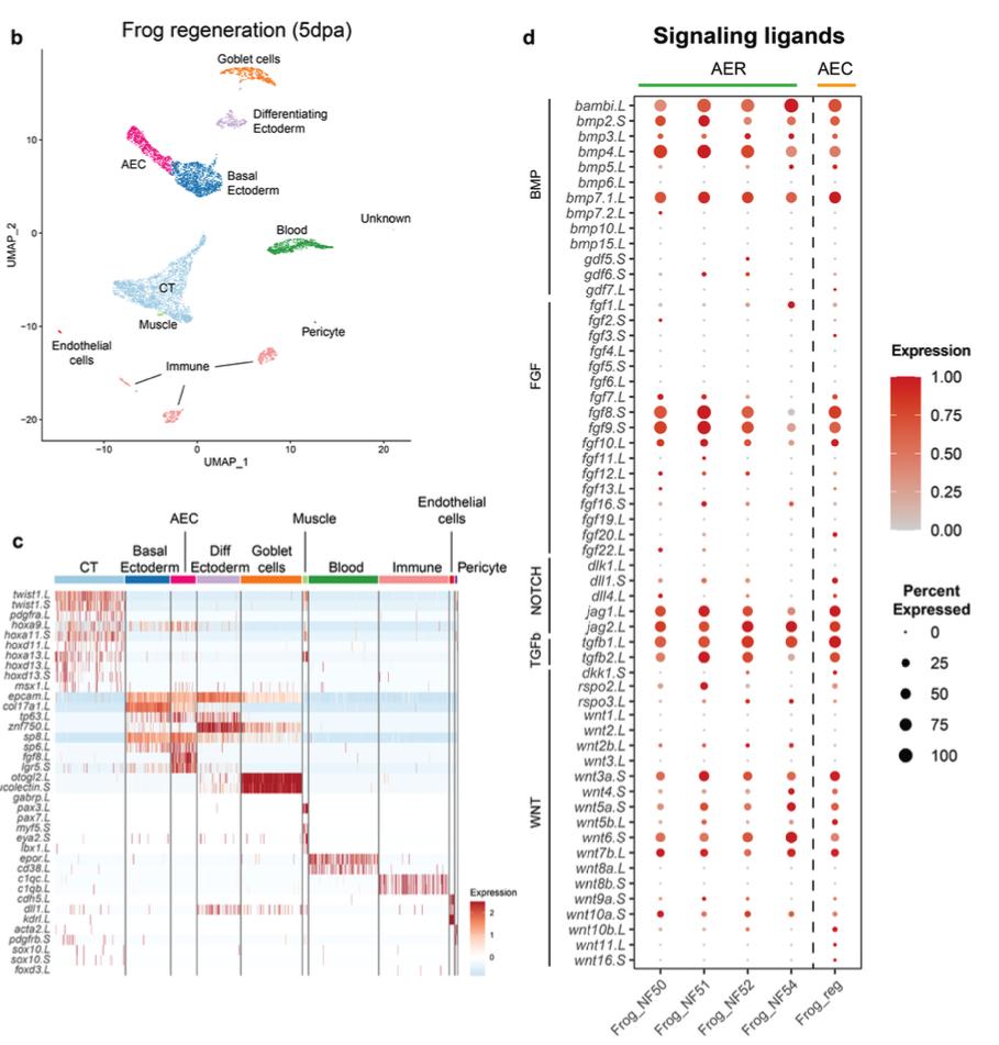 Supplementary Fig. 12 | Quality assessment of the re-analyzed publicly available Xenopus limb regeneration dataset. b) UMAP plot of the identified and annotated clusters. Clusters were annotated based on marker genes listed in Supplementary Fig. 12c. c) Heatmap showing the expression profile of marker genes that are used to annotate clusters. d) Dotplot showing signaling ligand expressions in the AER or AEC clusters during Xenopus laevis limb development and regeneration, respectively. Please note that a similar figure was generated in Aztekin et al, 2021, but in this figure, NF Stage 50, 51, and 52 from Lin et al. 2021 were used. |