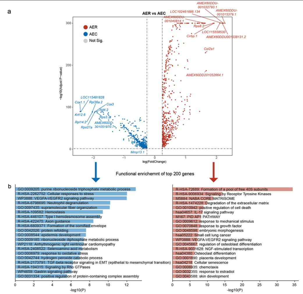 Supplementary Fig. 14 | Differentially expressed gene analysis between axolotl AER and AEC cells. a) Volcano plot showing the differentially expressed genes (DEGs) between axolotl AER and AEC populations. Red and blue dots indicate genes significantly enriched in the AER or the AEC, respectively. Gray dots indicate statistically not significant genes. The top 10 DEGs are labeled. b) Barplots showing enriched GO terms based on the top 200 DEGs (ordered by fold change) in AER (red) and AEC (blue) cells. |