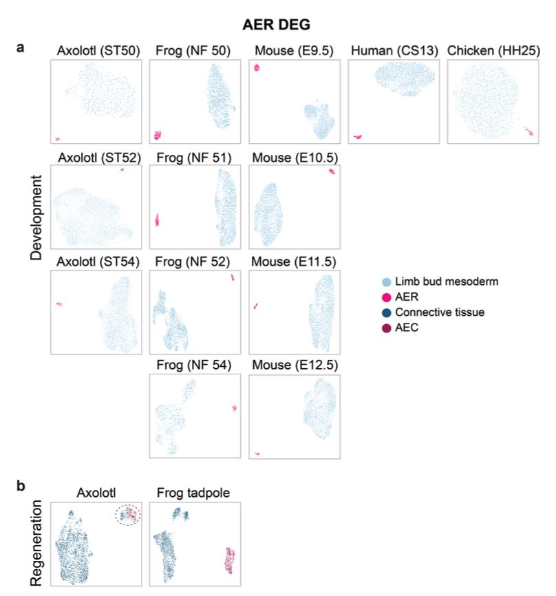 Supplementary Fig. 18 | Clustering based on differentially expressed AER gene sets for individual datasets. UMAP visualization of the clustering of indicated datasets of limb development (a) and regeneration (b) based on the top 500 AER DEGs in multi-species limb atlas (Fig. 1b) for individual datasets. In development datasets: light blue, limb bud mesoderm cells; pink, AER cells. In regeneration datasets: dark blue, CT cells; dark pink, AEC cells. Connective tissue cells gathered with the AEC population are highlighted with a dashed line. Please note that Mouse E10.5, chicken E4.5, human CS13, frog ST51, and axolotl ST52 development datasets, and the axolotl and frog tadpole regeneration datasets are also shown in Fig 4b and c. |