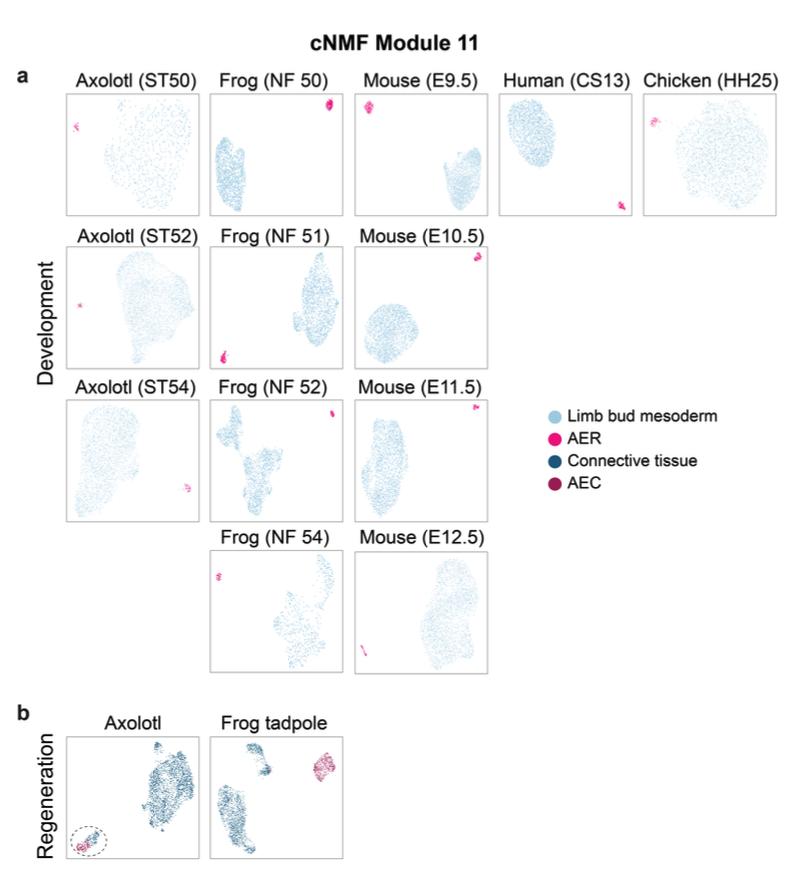Supplementary Fig. 19 | Clustering based on cNMF module 11 for individual datasets. UMAP visualization of the clustering of indicated datasets of limb development (a) and regeneration (b) based on the top 500 genes from AER-specific cNMF module 11 (Supplementary Fig. 16 and Supplementary Data 4). In development datasets: light blue, limb bud mesoderm cells; pink, AER cells. In regeneration datasets: dark blue, CT cells; dark pink, AEC cells. Connective tissue cells gathered with the AEC population are highlighted with a dashed line. |