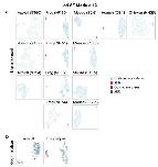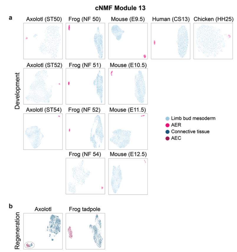 Supplementary Fig. 21 | Clustering based on cNMF module 13 for individual datasets. UMAP visualization of the clustering of indicated datasets of limb development (a) and regeneration (b) based on the top 500 genes from AER-specific cNMF module 13 (Supplementary Fig. 16 and Supplementary Data 4). In development datasets: light blue, limb bud mesoderm cells; pink, AER cells. In regeneration datasets: dark blue, CT cells; dark pink, AEC cells. Connective tissue cells gathered with the AEC population are highlighted with a dashed line. |