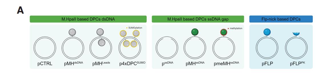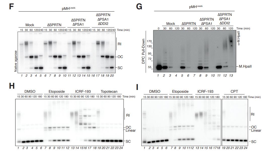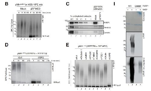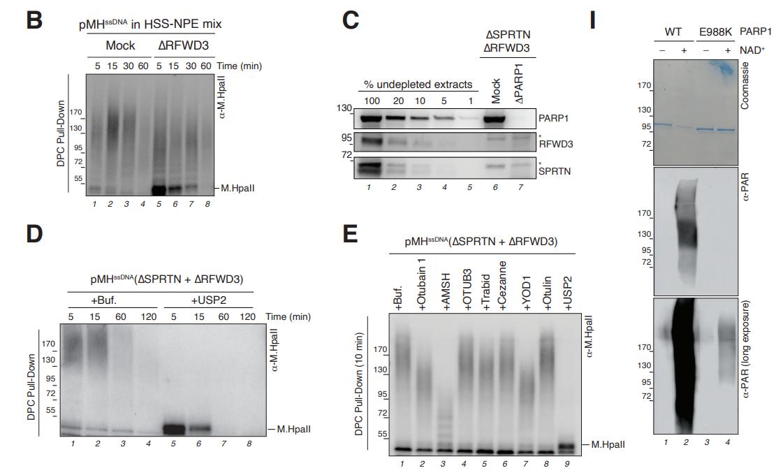 Fig. 1: DPCs on ssDNA gaps are ubiquitylated in a PARP1-dependent manner. A Schematic of DPC pull-down assay9. At given time points, the DPC plasmid is pulled down under stringent conditions, the DNA is digested by benzonase treatment, and M.HpaII is analyzed via immunoblotting. Note that although the M.HpaII antibody is generated against full-length M.HpaII, it is unlikely to recognize all degradation products. B pMHssDNA or pMHdsDNA were incubated in high-speed supernatant extract (HSS, which is an extract that does not support DNA replication) and recovered by DPC pull-down at the indicated time points and immunoblotted for crosslinked M.HpaII. Molecular weight marker (kDa) is indicated on the left side of the blot and in all subsequent blots presented in this manuscript. C pMHssDNA was incubated in SPRTN- or SPRTN- and RFWD3-depleted HSS and retrieved at the indicated time points by DPC pull-down as in B. D pMHssDNA repair in SPRTN- and RFWD3-depleted HSS. Reactions were supplemented with untagged- or FLAG-tagged recombinant ubiquitin. For each condition, a sample was retrieved at 1 and 10 min, and was first recovered by DPC pull-down (DPC-PD), subsequently by FLAG pull-down (FLAG-PD), and immunoblotted for crosslinked M.HpaII. E pMHssDNA was incubated in SPRTN- and RFWD3-depleted HSS in the presence of the indicated inhibitors. DPCs were recovered via DPC pull-downs at the indicated time points and immunoblotted for crosslinked M.HpaII. Note that the small upshift of M.HpaII signal observed in the presence of Ub.E1i (lanes 5 and 6) is due to M.HpaII PARylation (see Fig. 2D). F pMHssDNA repair in SPRTN- and RFWD3-depleted HSS, which was further mock- or PARP1-depleted in the presence and absence of PARP inhibitor (PARPi). Samples were recovered by DPC pull-down and immunoblotted for crosslinked M.HpaII. The asterisk marks an unspecific band. G Scheme of PARP1. It consists of three main domains: an N-terminal DNA-binding domain (DBD) consisting of zinc-finger (ZF) motifs, a central BRCT domain-containing automodification domain, and a conserved C-terminal catalytic domain (CD). H SPRTN-RFWD3-depleted HSS was further mock- or PARP1-depleted and blotted with PARP1 antibody. PARP1-depleted extracts were supplemented with either buffer (+Buf.), recombinant hPARP1 (+WT), or recombinant catalytically impaired E988K mutant (+E988K). I Add-back rescue experiment using the extracts from H. Samples were recovered by DPC pull-down and immunoblotted against M.HpaII. Source data are provided as a Source Data file. |