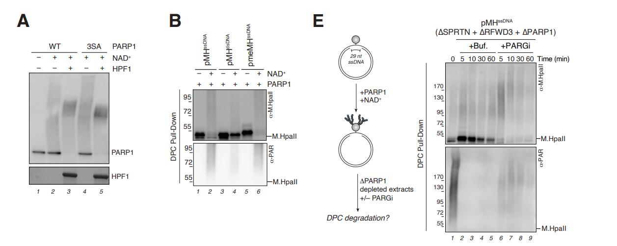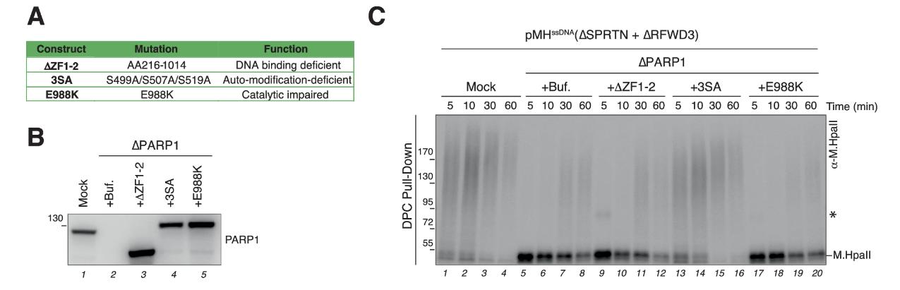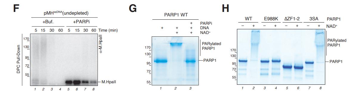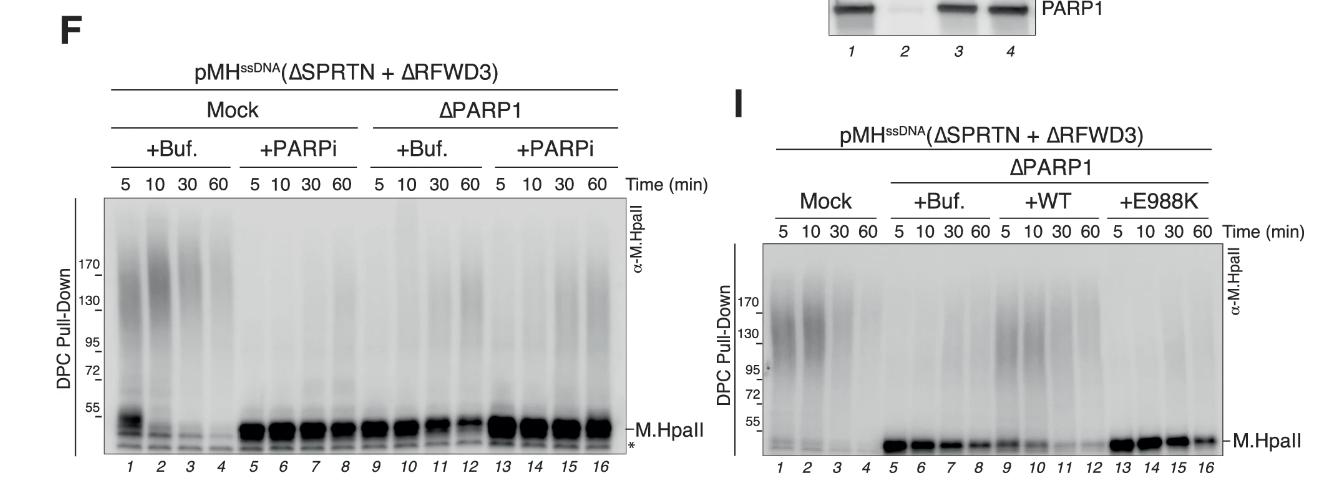 Supplementary Figure 2. A) In vitro autoPARylation assay of WT and E988K PARP1 in the presence and absence of HPF1. Top panel corresponds to immunoblot of PARP1; bottom panel correspond to Coomassie stain of HPF1. B) In vitro PARylation of the indicated DPCs, with and without NAD+. Samples were analyzed by SDS-PAGE and immunoblotted for indicated proteins C) pMHssDNA were added to RFWD3- and SPRTNdepleted HSS supplemented with PARG inhibitor (PARGi) or with PARGi+PARPi. Samples were recovered via DPC pull-down and immunoblotted with either M.HpaII or Poly/Mono-ADP Ribose antibody (a-PAR). D) pssDNA and pMHssDNA were incubated in SPRTN-RFWD3 depleted HSS supplemented with PARGi where indicated. DPC degradation and PARylation were monitored as in (C). E) Experimental setup for studying in vitro PARylated pMHssDNA repair in egg extracts. In vitro PARylated pMHssDNA was incubated in SPRTN-RFWD3-PARP1 depleted HSS in the absence and presence of PARGi. DPC degradation and PARylation were monitored as in (C). F) HSS dilution series and depletion controls of HPF1. G) pMHssDNA were incubated in SPRTN-RFWD3- and HPF1-depleted HSS. DPC degradation was monitored as in (C). |