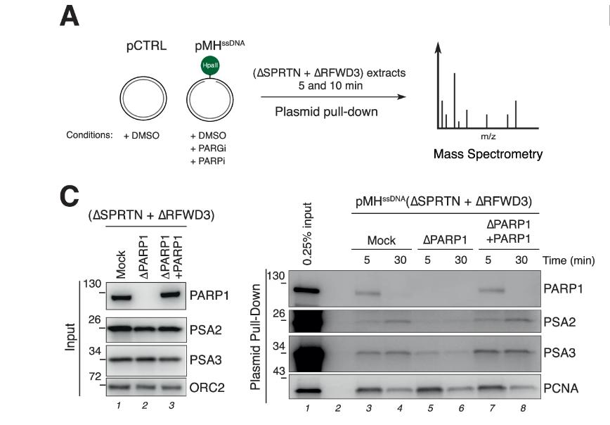 Fig. 3: Plasmid Pull-down Mass Spectrometry (PP-MS) reveals proteasome and PAR-dependent E3 ubiquitin ligase recruitments. A Overview of reaction conditions for PP-MS analysis. B Heatmap showing the mean of the z-scored log2 label-free quantitation (LFQ) intensity (i.e., protein abundance) from four biochemical replicates of pCTRL and pMHssDNA incubated in SPRTN-RFWD3-depleted HSS in the presence of the indicated inhibitors. Dynamic proteins, responsive to PARGi and/or PARPi treatment, were selected. C pMHssDNA was incubated in SPRTN-RFWD3-depleted HSS, which was then additionally mock-depleted, PARP1-depleted, or PARP1-depleted and supplemented with recombinant PARP1 (Input, left WB). Plasmids were recovered via plasmid pull-down and protein recruitment to the plasmid was monitored with the indicated antibodies. D pMHssDNA was incubated in SPRTN-RFWD3-depleted HSS, which was further mock-depleted, PSA1-depleted, DDI2-depleted, or PSA1- and DDI2-depleted. Samples were recovered by DPC pull-down and immunoblotted against M.HpaII. Source data are provided as a Source Data file. |