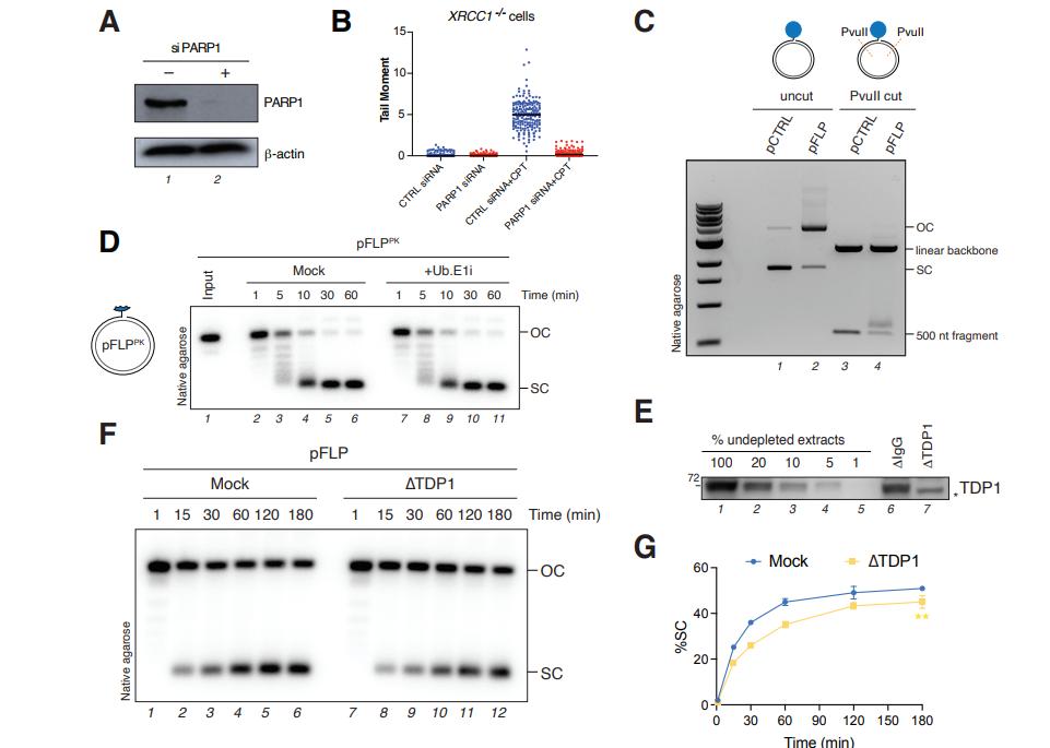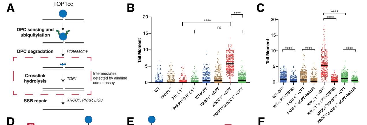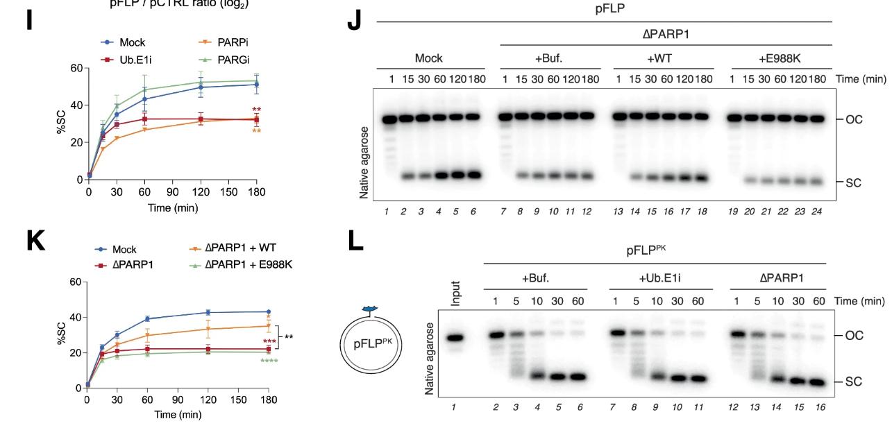 Fig. 4: PARP1 orchestrates TOP1cc and TOP1cc-like DPC repair. A Schematic illustrating the current model of TOP1cc repair. B PARP1 deletion suppresses the visibility of camptothecin-induced SSBs. The indicated RPE-1 cells were incubated with 10 µM camptothecin for 1 h and then processed for alkaline comet assays to measure unrepaired SSBs. Data show the median Tail moment of 300 cells combined from three independent experiments (100 cells/experiment). Significant differences were determined by 2-way ANOVA with Sidak’s post hoc multiple comparisons test. CPT denotes camptothecin. **** denotes p-value ≤0.0001. C Proteasome inhibition and/or PARP1 deletion suppresses the visibility of camptothecin-induced SSBs in the alkaline comet assay pre-treated with proteasome inhibitor (50 µM MG132) 2 h prior to and during camptothecin treatment as above. D To generate pFLP, Flp-nick is crosslinked to a plasmid containing the FRT site. Products of Flp-nick incubation with a CTRL (pCTRL) or FRT-site containing plasmid (pFRT) were analyzed on a native agarose gel. E pFLP was incubated in non-replicating egg extracts (1:2 HSS:NPE ratio) in the absence and presence of Ub.E1i. Reaction samples were analyzed by native agarose gel electrophoresis. F Quantification of the experiment shown in E. Error bars represents the SD of the mean. n = 3 independent experiments. Significant differences were determined by a two-tailed unpaired t-test. ** denotes p-value ≤0.01 (p = 0.0061). G Analysis of protein recruitment to pFLP compared to pCTRL via PP-MS. Plasmids were recovered at 10 min after addition in non-replicating egg extracts (1:2 HSS:NPE ratio). The volcano plot shows the difference in the abundance of proteins between the two sample conditions (x-axis), plotted against the p-value resulting from two-tailed Student’s two-sample t-testing (y-axis). Proteins significantly down- or up-regulated (cutoff line represents permutation-based FDR < 5%) are represented in red or blue, respectively. n = 4. H pFLP was incubated in non-replicating egg extracts (1:2 HSS:NPE ratio) in the absence and presence of the indicated inhibitors. Reaction samples were analyzed as in (E). I Quantification of the experiment shown in (H) as in (F). Error bars represent the SD of the mean. n = 3 independent experiments. Significant differences were determined by a two-tailed unpaired t-test. ** denotes p-value ≤0.01 compared to the Mock control (p = 0.0052 for PARPi and p = 0.0061 for Ub.E1i). J Add-back rescue experiment with WT and E988K PARP1 in non-replicating egg extracts (1:2 HSS:NPE ratio). Reaction samples were analyzed as in (E). K Samples from (J) were quantified as in (F). Error bars represent the SD of the mean. n = 3 independent experiments. Significant differences were determined by a two-tailed unpaired t-test. *** and **** denote p-value ≤0.001 and p-value ≤ 0.0001 compared to the Mock control, respectively. ** denotes p-value ≤0.01 compared to the PARP1 depletion control (p = 0.0054). * denotes p-value ≤0.05 compared to Mock control (p = 0.02). L pFLPPK was incubated in non-replicating egg extracts (1:2 HSS:NPE ratio) egg extracts in the absence and presence of Ub.E1i or in PARP1-depleted egg extracts. Reaction samples were as in E. Source data are provided as a Source Data file. |
