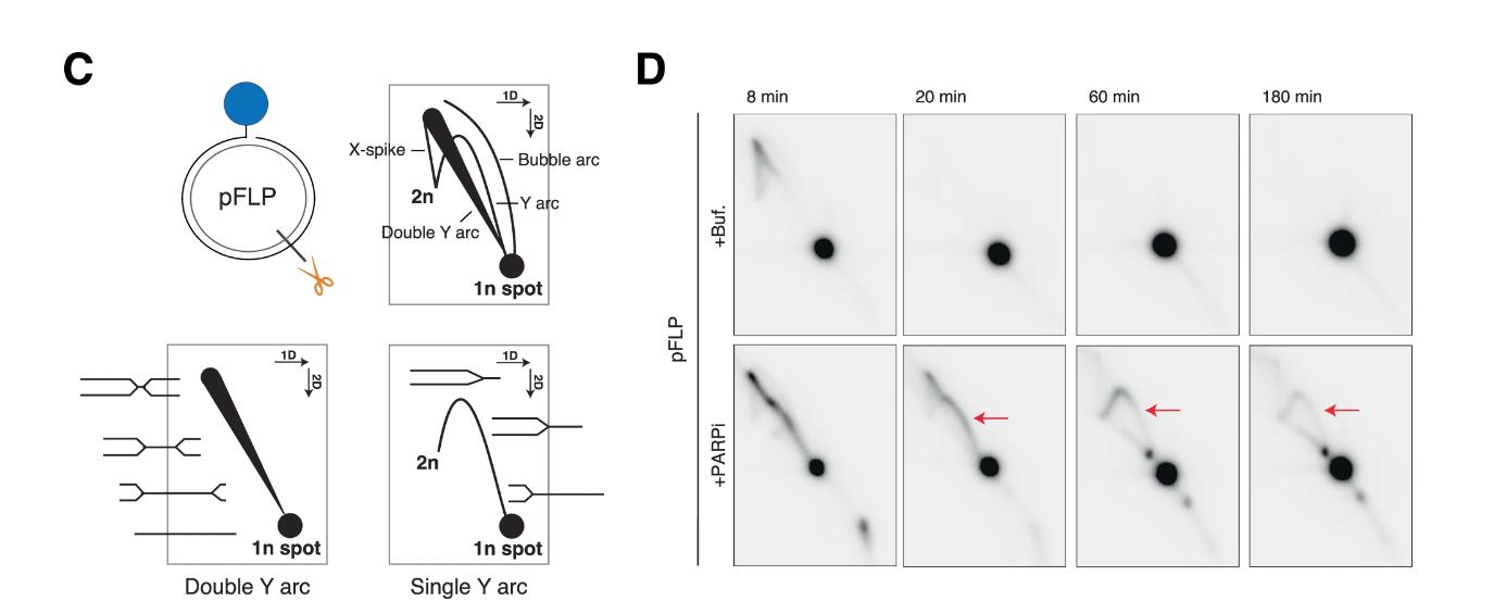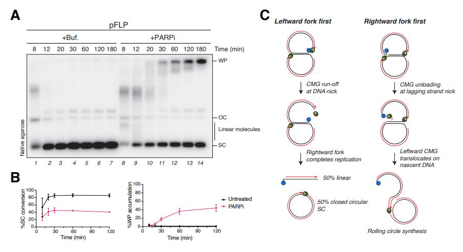 Supplementary Figure 6. A) Samples taken from [a32P]dATP labelled reaction in experiment 5B and run on a native agarose gel. B) Quantification of supercoiled (SC) and well products (WP) from Figure 5A. Error bars represent the SD. n=3. C) Model of pFLP replication in the presence of PARPi. |
