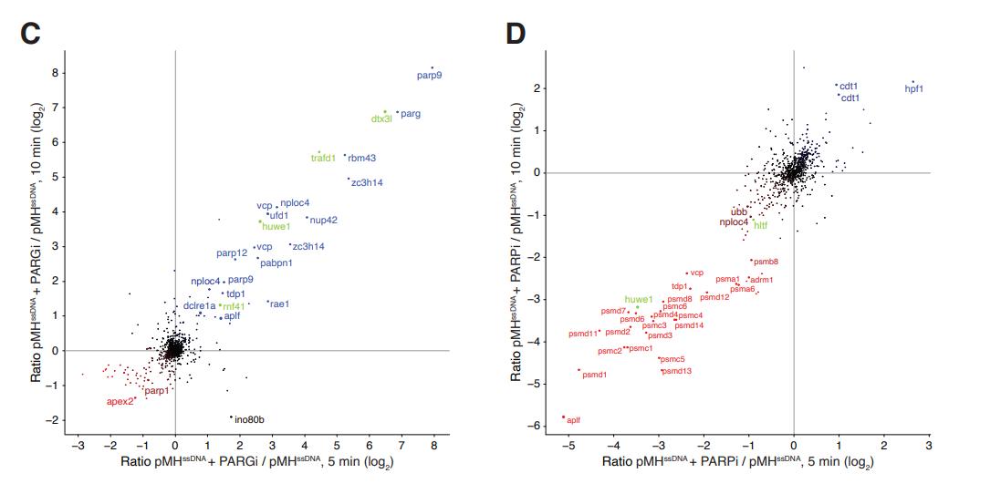 Supplementary Figure 3. A) Heatmap showing the mean of the Z-scored log2 label-free quantitation (LFQ) intensity (i.e. protein abundance) from four biochemical replicates of pCTRL, pmeMHssDNA and pMHssDNA incubated in SPRTN-RFWD3 depleted HSS in the presence of the indicated inhibitors. Dynamic proteins, responsive to PARGi and/or PARPi treatment, were selected. The experiment shown is the same as the one in Figure 3, but with the pmeMHssDNA added to the analysis. B) Scatter plot analysis of protein recruitment to pMHssDNA. The mean log2abundance ratio between proteins enriched in the pMHssDNA compared to pCTRL at 5 min is plotted against the abundance ratio at 10 min. Blue and red dots indicate proteins significantly recruited to or excluded from pMHssDNA compared to pCTRL, respectively. Ubiquitin E3 ligases are highlighted in green. Significance was determined by two-tailed Student’s two-sample t test with s0 = 0.1 and FDR ≤ 0.05. n=4. Full results reported in Table S1. Note that different isoforms of the same protein can be detected (e.g. TRIP12). B-D) Scatter plot analysis of protein recruitment to pMHssDNA in the presence of PARGi or PARPi presented in (C) but in the pMHssDNA + inhibitor / pMHssDNA conditions. |