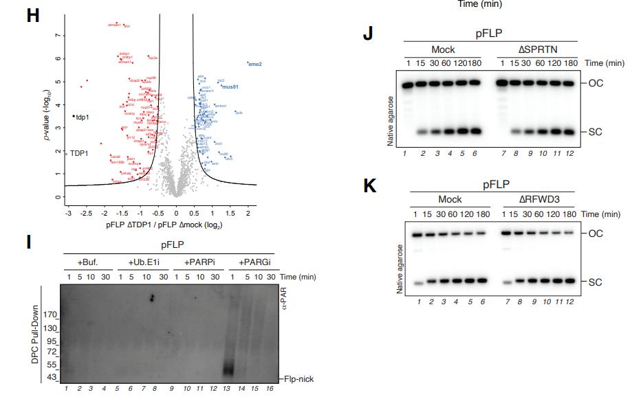 Supplementary Figure 5. A) Levels of PARP1 and b-actin protein in cell extracts from XRCC1-/- RPE-1 cells following transfection with control or anti-PARP1 siRNA. B) SSB levels measured by alkaline comet assays in the cell lines described in (A), following incubation for 1 h with 10 µM camptothecin. For each sample, data show the median Tail moment of 200 cells combined from two independent experiments (100 cells/experiment). C) pCTRL and pFLP samples were analyzed on a native agarose gel in the presence of EtBr. Where indicated, substrates were digested with PvuII restriction enzyme to release a 500 nt long DNA fragment containing the crosslinked protein. Gel shift indicates successful crosslinking. D) pFLPPK was incubated in non-replicating egg extracts (1:2 HSS:NPE ratio) in the absence and presence of Ub.E1i. Reaction samples were analyzed by native agarose gel electrophoresis. E) TDP1-depleted non-replicating egg extracts (1:2 HSS:NPE ratio) were blotted with a TDP1 antibody. Asterisk marks an unspecific band. F) pFLP was incubated in mock- or TDP1-depleted non-replicating egg extracts (1:2 HSS:NPE ratio). Reaction samples were analyzed by native agarose gel electrophoresis. G) Samples from (F) were quantified as in (Fig. 4F). Error bars represent the SD of the mean. n=6. Significant differences were determined by a two-tailed unpaired t test. ** denotes p-value ≤ 0.01 compared to the Mock control (p=0.0132). H) Analysis of protein recruitment to pFLP in TDP1-depleted compared to mock-depleted non-replicating egg extracts (1:2 HSS:NPE ratio). Plasmids were recovered at 10 min. The volcano plot shows the difference in abundance of proteins between the two sample conditions (xaxis), plotted against the p-value resulting from two-tailed Student’s t-testing (y-axis). Proteins significantly down- or up-regulated (cutoff line represents permutation-based FDR<5%) are represented in red or blue, respectively. n=4. Full results reported in Table S3. I) pFLP was incubated in non-replicating egg extracts (1:2 HSS:NPE ratio) in the presence of the indicated inhibitors. Samples were recovered via DPC pull-down and blotted against Poly/Mono-ADP ribose antibody (a-PAR). J) pFLP was incubated in mockand SPRTN-depleted egg extracts. Reaction samples were analyzed by native agarose gel electrophoresis. K) pFLP was incubated in mock- and RFWD3-depleted egg extracts. Reaction samples were analyzed as in (J). |