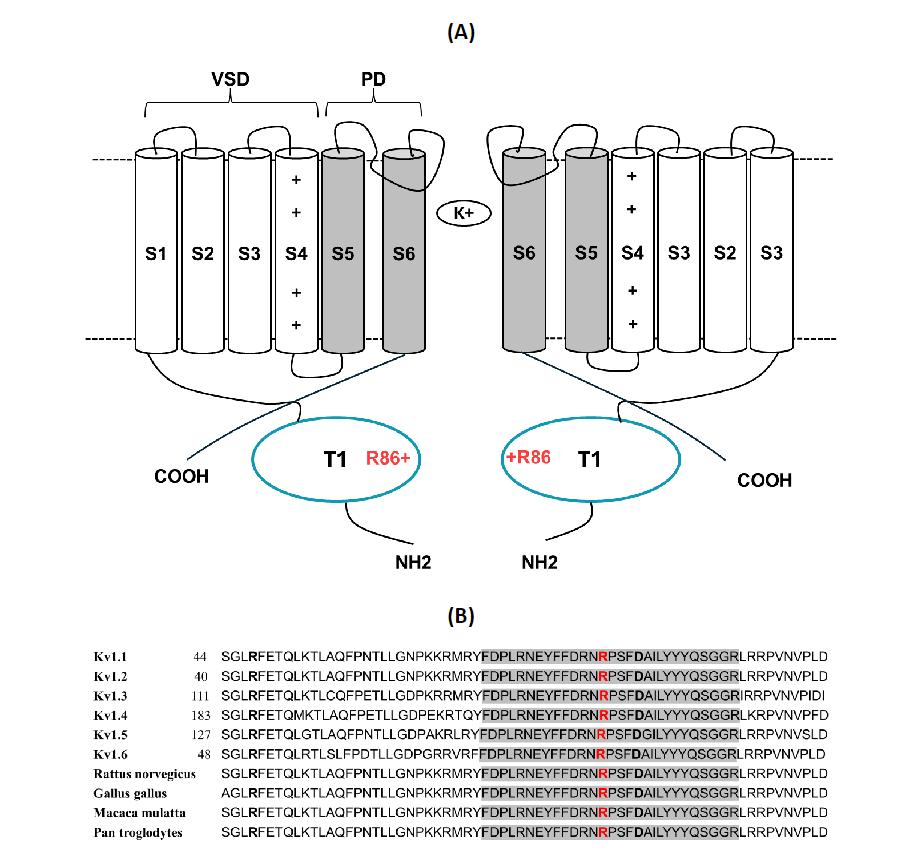 Figure 1. (A) Schematic Kv1.1 model showing two of the four α-subunits with the approximate location of residue R86 (red) within the T1 domain of the N-terminus. A K + ion is shown in the transmembrane conduction pore. The T1 pore lies beneath the transmembrane pore with R86 at the T1-T1 interface. (B) Sequence alignment of a portion of the T1 region. The Arginine residue of interest is shown in red. The grey highlighted area is the most conserved portion of the T1 sequence. Kv1.1 R86 is conserved within the Kv1 family of Homo sapiens and in various species. Kv1.1 R47 and D90 (in black bold) are also conserved. The number of the first amino acid in each sequence is indicated. Sequence alignments were generated using BLAST (NCBI, US).