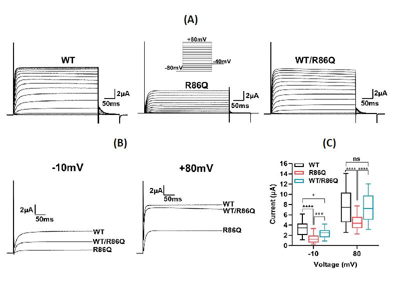 Figure 2. (A) Representative Kv1.1 current recordings from oocytes injected with WT, mutated (R86Q), and WT and mutated (WT/R86Q) cRNA. Voltage-clamp protocol for Kv1.1 currents is indicated on top of the R86Q recording. Oocytes were depolarized to 17 potentials, from -80 to +80 mV from a holding potential of -80 mV. (B)373Representative currents at -10 mV and +80 mV. (C) Left box plot showing significant difference in mean steady-state amplitude between all three groups at -10 mV test potential. The right box plot shows mean current amplitudes for the three groups recorded at +80 mV. Solid lines in box indicate the median, boxes indicate lower and upper quartiles, and whiskers the minimum and maximum. Steady state mean amplitudes were obtained at approximately 400 ms. WT: n=27, R86Q: n=28, WT/R86Q: n=20. *p<0.05, ***p <0.001, **** p<0.0001.