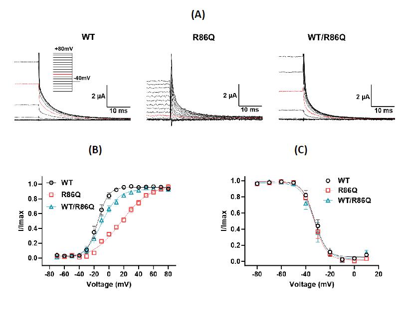 Figure 3. (A) Representative activation tail currents. Protocol for tail currents is indicated above the WT current. (B) Po curves were derived from peak tail amplitudes measured at -40 mV that were normalized to maximum peak and plotted as a function of various pre-pulse potentials. (C) Inactivation curves were obtained from normalized steady state +40 mV currents after various depolarizing 20 s pre-pulses from -80 to +20 mV. Normalized amplitudes were plotted as a function of pre-pulse potentials. Both activation (B) and inactivation curves (C) were fitted with the Boltzmann function.