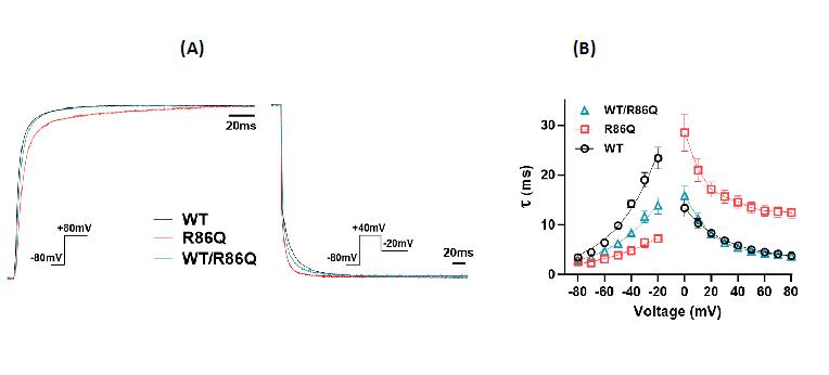 Figure 4. (A) To the left are the superimposed activation currents recorded at +80 mV. To the right are representative deactivation currents recorded at -20 mV. Currents were normalized to their respective peaks. (B) Activation and deactivation time constants plotted as a function of the test voltage. On the right of the graph are the activation time constants (τ) derived from rising phases of currents. Curves to the left are deactivation curves. Data points represented are mean ± SE, n=8 for each group