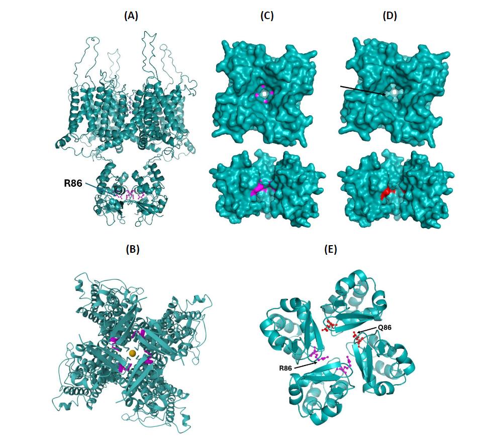 Figure 5. (A) Ribbon representation of the side view of the Kv1.1 tetrameric channel showing the location of R86 as a ball-and-stick representation in magenta. (B) View of the Kv1.1 tetramer from the intracellular side showing R86 at the interface in magenta. The potassium ion (yellow sphere) can be seen in the center of the pore. (C) Molecular surface representation of the N-terminal tetramer showing R86 at the T1 cavity interface. Top figure: View from393the intracellular side. Bottom figure: Side view with one N-terminal subunit removed for clarity. (D) Molecular surface representation of four mutated subunits assembled. Top figure: Q86 is not visible from the intracellular side. Arrow indicates the cavity where R86 used to be. Bottom figure: Q86 (red) is only visible from the side view following the removal of one subunit. The mutation resulted in a change to the structure of the T1 cavity. The representation and angle are the same as shown in c. (E) Tetrameric assembly of the T1 domains made up of two WT T1 subunits with R86 represented as ball and sticks in magenta, and two mutated T1 subunits with the Q86 residue in red. This tetrameric two by two configuration is one of several possible combinations of WT and mutated subunit associations View is from the intracellular side.