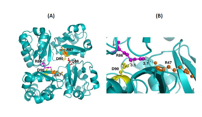 Figure 6. (A) N-terminal tetramer showing the proximity of D90 (yellow) and R47 (orange) to R86 (magenta) and Q86 (red). (B) Distances between two atoms are indicated as dashes. Numbers are the distance in angstroms of the polar bonds measured using PyMol.