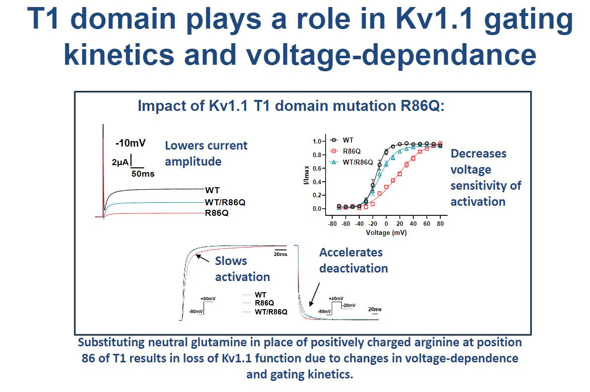 Within the tetramerization domain (T1) of most voltage-gated potassium channels (Kv) are highly conserved charged residues that line the T1-T1 interface. We investigated the Kv1.1 residue R86 located at the narrowest region of the T1 interface. A Kv1.1 R86Q mutation was reported in a child diagnosed with lower limb dyskinesia [1]. The child did not present with episodic ataxia 1 (EA1) symptoms typically associated with Kv1.1 loss-of-function mutations. We characterized the electrophysiological outcome of the R86Q substitution by expressing Kv1.1 in Xenopus laevis oocytes. Mutated α-subunits were able to form functional channels that pass delayed rectifier currents. Oocytes that expressed only mutated α-subunits produced a significant reduction in Kv1.1 current and showed a positive shift in voltage-dependence of activation. In addition, there was substantially slower activation and faster deactivation implying a reduction in the time the channel is in its open state. Oocytes co-injected with both mutated and wild-type cRNA in equal amounts, to mimic the heterozygous condition of the disease, showed a decrease in current amplitude at -10mV and faster deactivation kinetics when compared to the wild-type channel. These findings indicate that T1 plays a role in Kv1.1's voltage-dependent activation and in its kinetics of activation and deactivation.