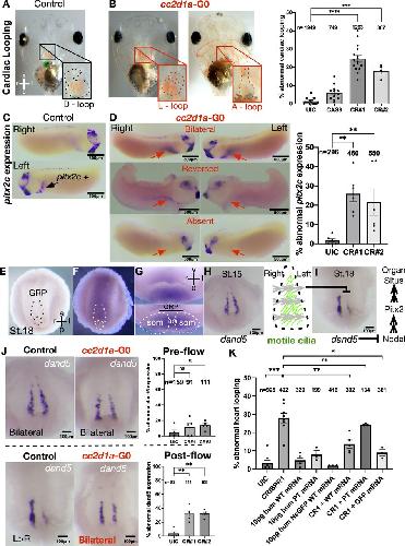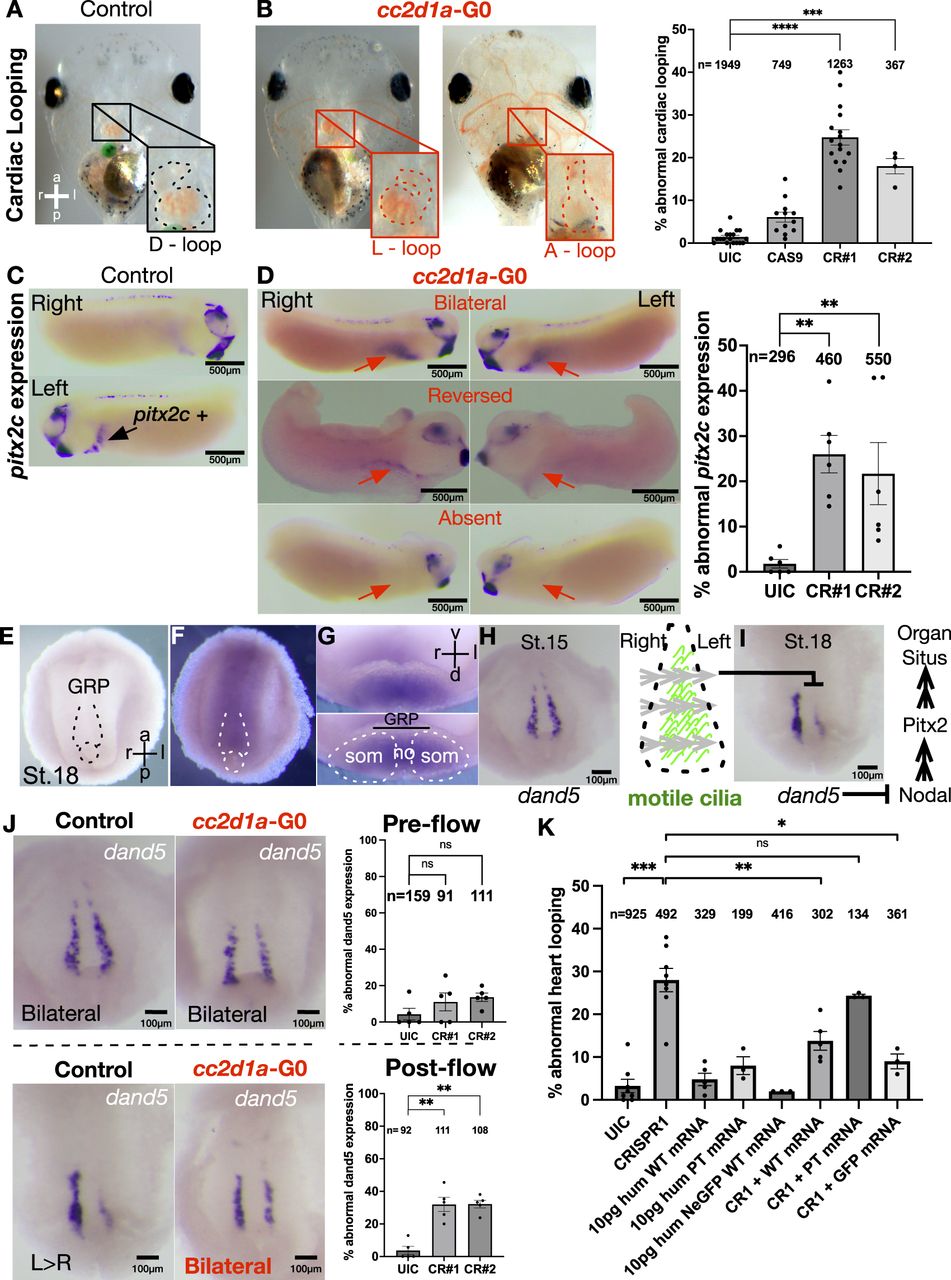 (A, B) Representative images of cardiac outflow tract morphology and looping phenotypes in ventrally imaged st.45 Xenopus embryos. cc2d1a mutants with abnormal looping (L-loop and A-loop) are shown in red. Quantification of % cardiac looping defects in uninjected control (UIC) embryos, Cas9-only control, and cc2d1a CRISPR#1 and CRISPR#2. CR#1- and CR#2-injected embryos displayed 24% and 17% looping defects, respectively. Data are shown as the mean ± SEM. Black dots represent individual experiments, and the number of embryos is indicated above columns. P < 0.001 (***), P < 0.0001 (****). a, anterior; p, posterior; l, left; r, right; D-loop, dextra-looped; L-loop, levo-looped; A-looped, ambiguous-looped; G0, generation 0; UIC, uninjected control; CR, CRISPR. (C) Whole-mount in situ hybridization of st.28 control embryos showing the pitx2c signal (black arrow) on the left lateral plate mesoderm. (D) Representative images of st.28 cc2d1a mutant embryos with abnormal pitx2c expression patterns (bilateral, reversed expression, or absent signal). Red arrows indicate the location of the present or missing pitx2c signal. CR#1- and CR#2-injected embryos displayed 26% and 22% abnormal pitx2c expression, respectively. P < 0.01 (**). (E, F) Whole-mount in situ hybridization images of dissected GRPs from st.18 Xenopus embryos with sense (E) and antisense (F) probes against cc2d1a RNA. The black and white dotted area delineates the GRP, a ciliated structure that helps establish left–right patterning. GRP, gastrocoel roof plate. (G) GRP cross section shows cc2d1a expression in the somites and notochord. GRP, gastrocoel roof plate; som, somites; no, notochord; v, ventral; d, dorsal. (H) At st.15, an upstream LR patterning marker, dand5, is present symmetrically on both sides of the GRP. Motile cilia (green lines) emerge and start to beat from right to left around st.18–19. The gray arrows indicate the fluid flow generated by the cilia. (I) Leftward fluid flow inhibits dand5 expression on the left side of the GRP, leading to up-regulated pitx2c, which results in correct left–right asymmetry/organ situs. (J) Whole-mount in situ hybridization images of st.15 pre-flow GRPs (top panel) show bilateral dand5 expression in cc2d1a mutant embryos, resembling the UICs. St.18 post-flow (bottom panel) cc2d1a mutant GRPs show bilateral dand5 expression unlike the asymmetric expression shown in UICs. CR#1 and CR#2 GRPs both showed 32% abnormal post-flow dand5 expression. ns, not significant; P < 0.01 (**). (K) Quantification of % abnormal heart looping in UICs, CR#1 knockdown, human WT CC2D1A mRNA (10 pg), CC2D1A c.1186C>T p.Arg396* human patient variant mRNA (10 pg), and human N-GFP WT CC2D1A mRNA (10 pg). cc2d1a mutant heart looping defects are rescued by human WT CC2D1A mRNA (15% rescue) and N-GFP WT CC2D1A mRNA (50% rescue). The rescue fails with the patient variant mRNA (25% abnormal looping). Data are shown as the mean ± SEM. ns, not significant; P < 0.05 (*), P < 0.01 (**), P < 0.001 (***). pg, picograms; WT, wild type; GFP, green fluorescent protein; hum, human. |