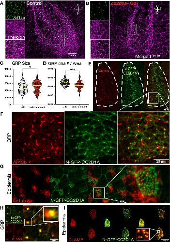 (A, B) Immunofluorescence images of control (A) and cc2d1a-depleted GRPs (B) stained with anti-Arl13b antibody (green) and merged with phalloidin (purple). Scale bar = 50 μm. (C, D) Quantification of the GRP size and (D) number of cilia per GRP area. Compared with the control, cc2d1a mutant embryos showed no significant difference in the GRP size, but did have fewer GRP cilia per area. ns, not significant; P < 0.0001 (****). (E) Immunofluorescence images of GRP (outlined in white) expressing human N-GFP CC2D1A (green) stained with anti-Arl13b (red). (F) Zoomed-in images of GRP. Human N-GFP CC2D1A is expressed in the base of the monocilia. Scale bar = 25 µm. (G) Immunofluorescence images of the epidermis of st.28–30 embryos expressing human N-GFP CC2D1A (green) stained with anti-AcTub (red) to show cilia. Human N-GFP-CC2D1A localizes to the base of cilia in multiciliated cells (MCCs). The rightmost merged image is a close-up of a MCC. Scale bar = 10 μm. (H, I) St.28–30 embryos expressing human N-GFP-CC2D1A (green) and CLAMP-RFP (red), which marks the rootlets. (H, I) Merged images show CC2D1A localizes to the tip of the ciliary rootlets in both GRP monocilia ((H); scale bar = 5 μm) and epidermal MCCs ((I); scale bar = 15 μm).